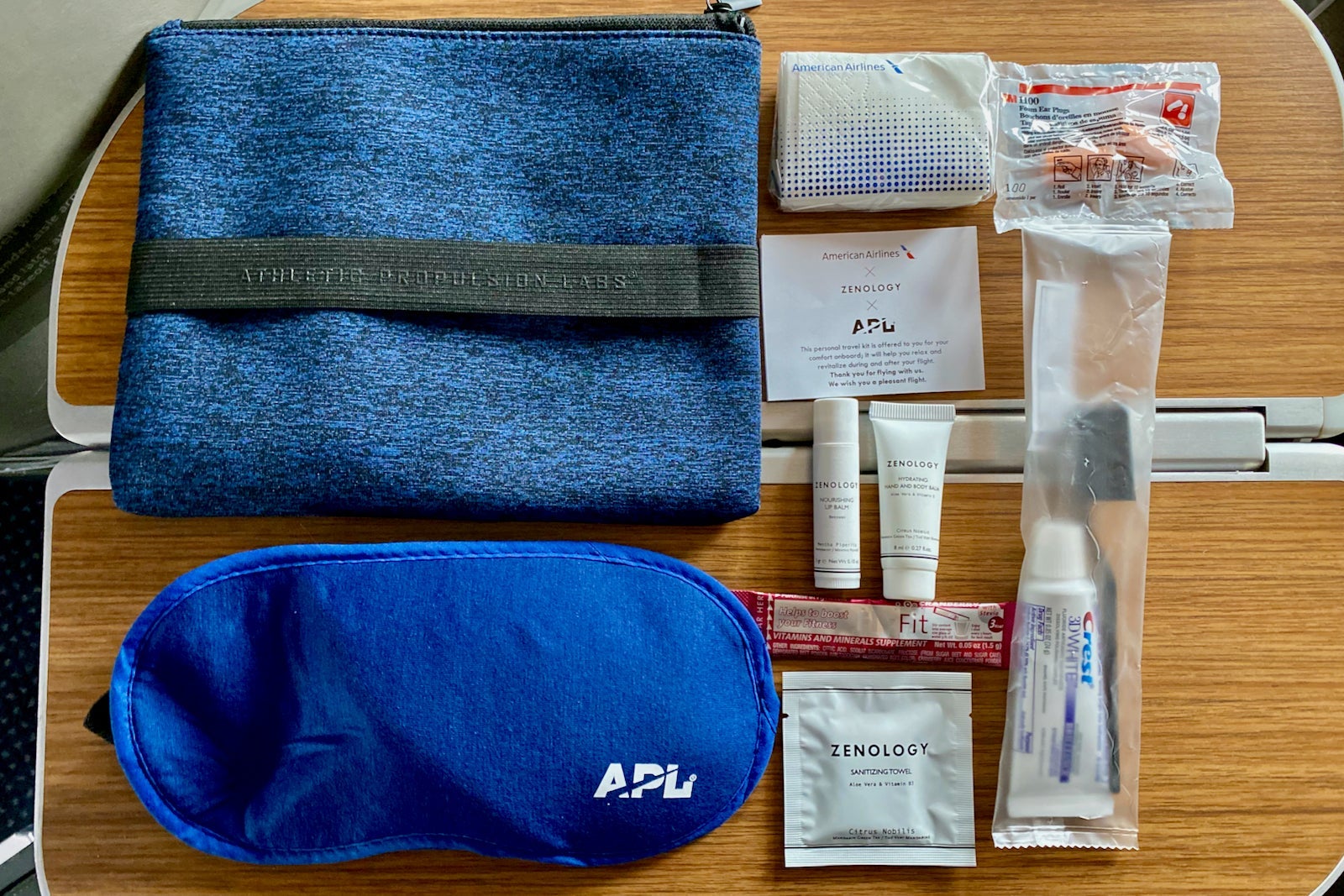 Waiting at my seat during boarding was a well-stocked Athletic Propulsion Labs amenity kit. It included an APL-branded eye mask, dental kit, earplugs, tissues, lip and hand balm and sanitizing towel. There was also a FlyFit vitamins and minerals supplement, the first time I've seen such a thing in an airline amenity kit.