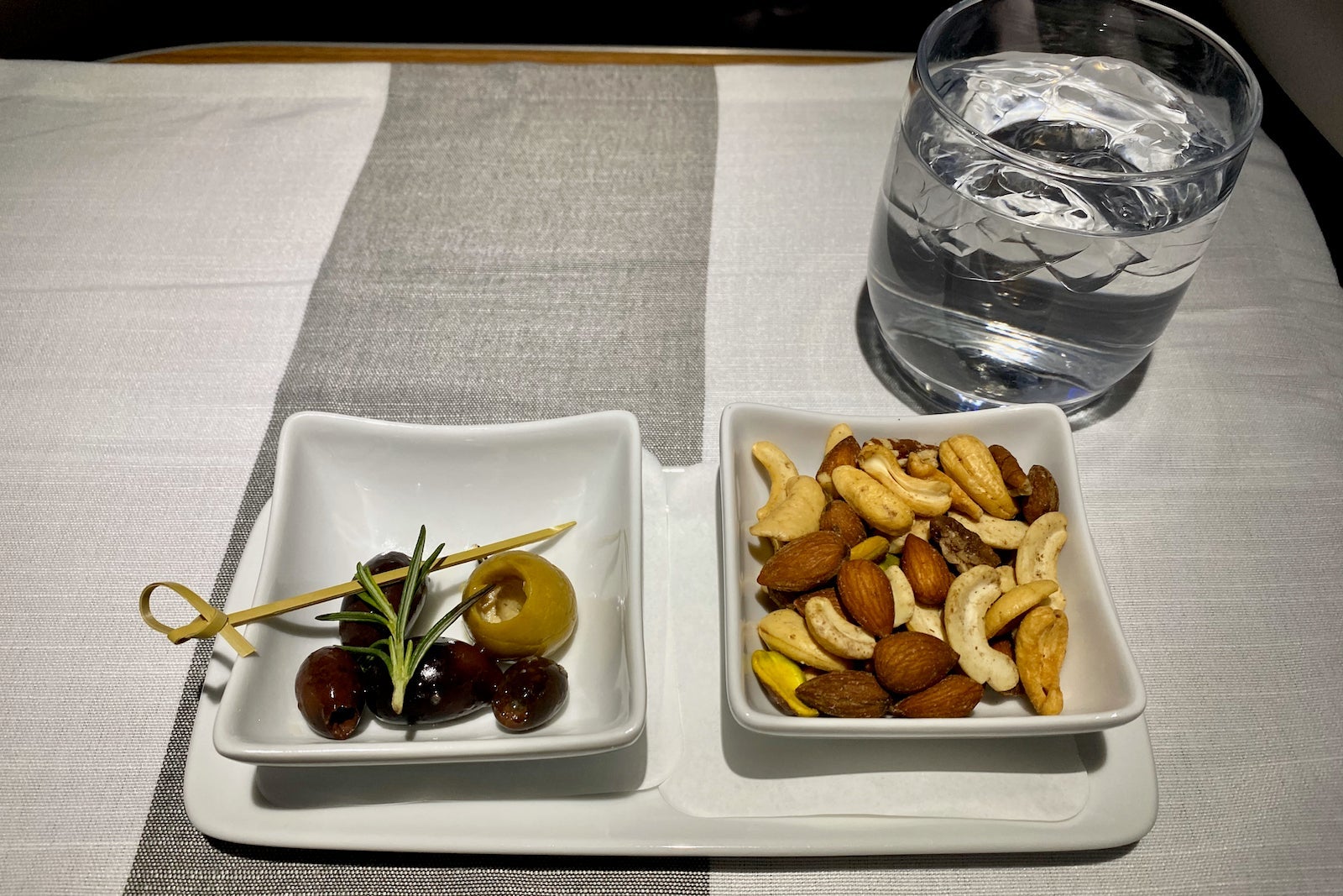 Service began promptly once we hit 10,000 feet. I was first served some warmed mixed nuts and olives with my drink of choice (water, in this case).
