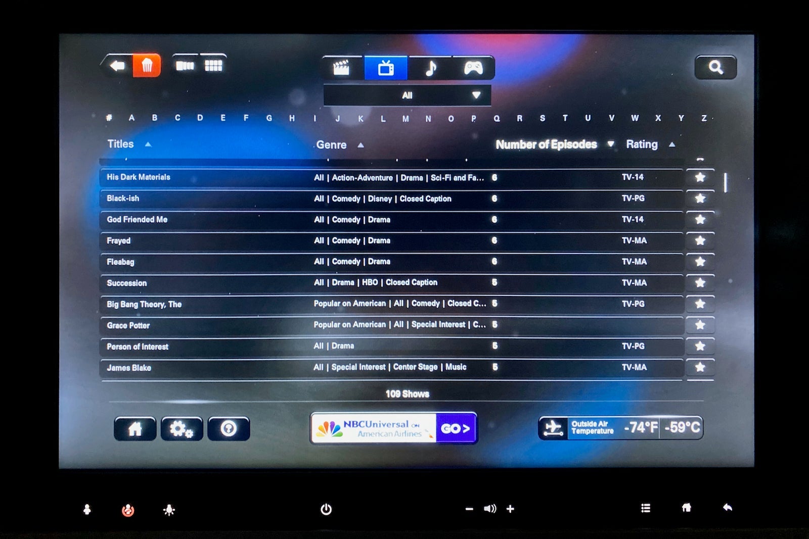 The IFE was loaded with tons of content, though it was missing both live TV and a tailcam. It featured 179 movies, including 71 new releases like "A Hidden Life" and "The Lion King." There were also 109 TV shows, including full seasons of the "Big Bang Theory," "Downtown Abbey" and "Friends." (You could find even more content on your personal device through the streaming Wi-Fi network.)