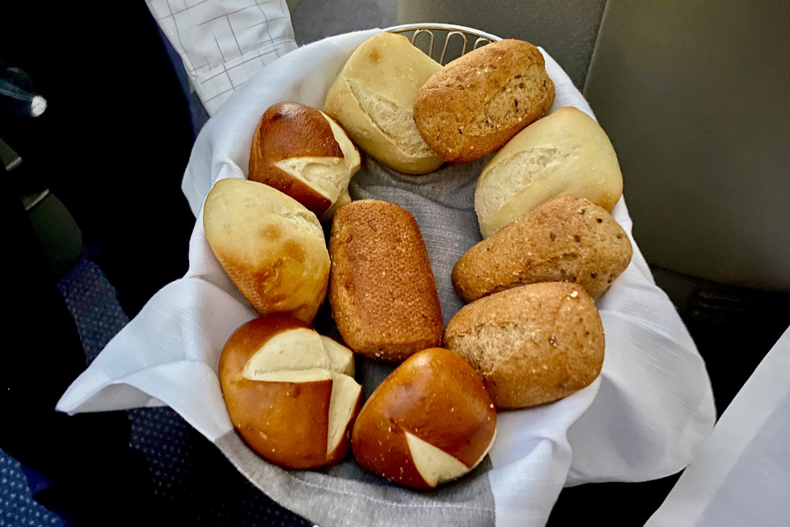 Shortly thereafter, the flight attendant brought around a bread basket with a choice of white, wheat or pretzel roll. Though I love pretzel rolls, I didn't touch mine. Why? Because the flight attendant took the bread basket to each seat and allowed each passenger to point at their selection. Though he served the bread with tongs, I was nervous about possible contamination in light of the coronavirus pandemic. In fact, I wouldn't be shocked if bread baskets were gone forever.