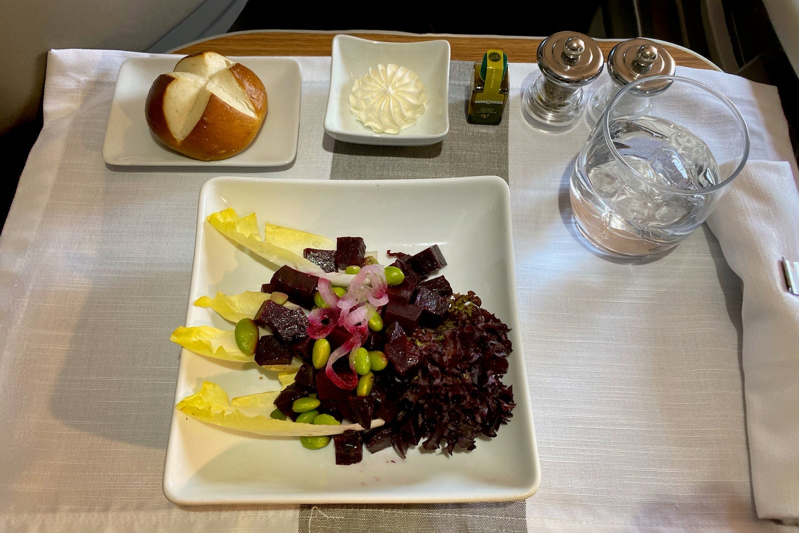 After the snacks, my table was set by hand. The purser then brought out my appetizer of beet tartare with edamame and pickled onions. It was a delicious taste of California cuisine.