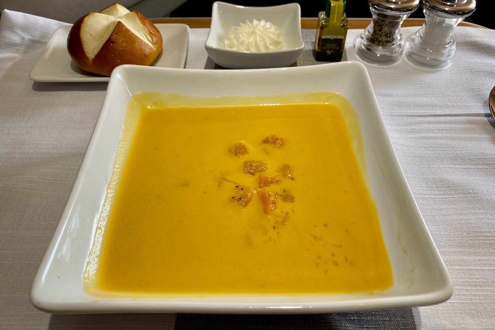 I was served a butternut squash soup about five minutes after finishing my appetizer. I loved this soup, and wish that more airlines served soup on board. It reheats well and retains its flavor at high altitudes.