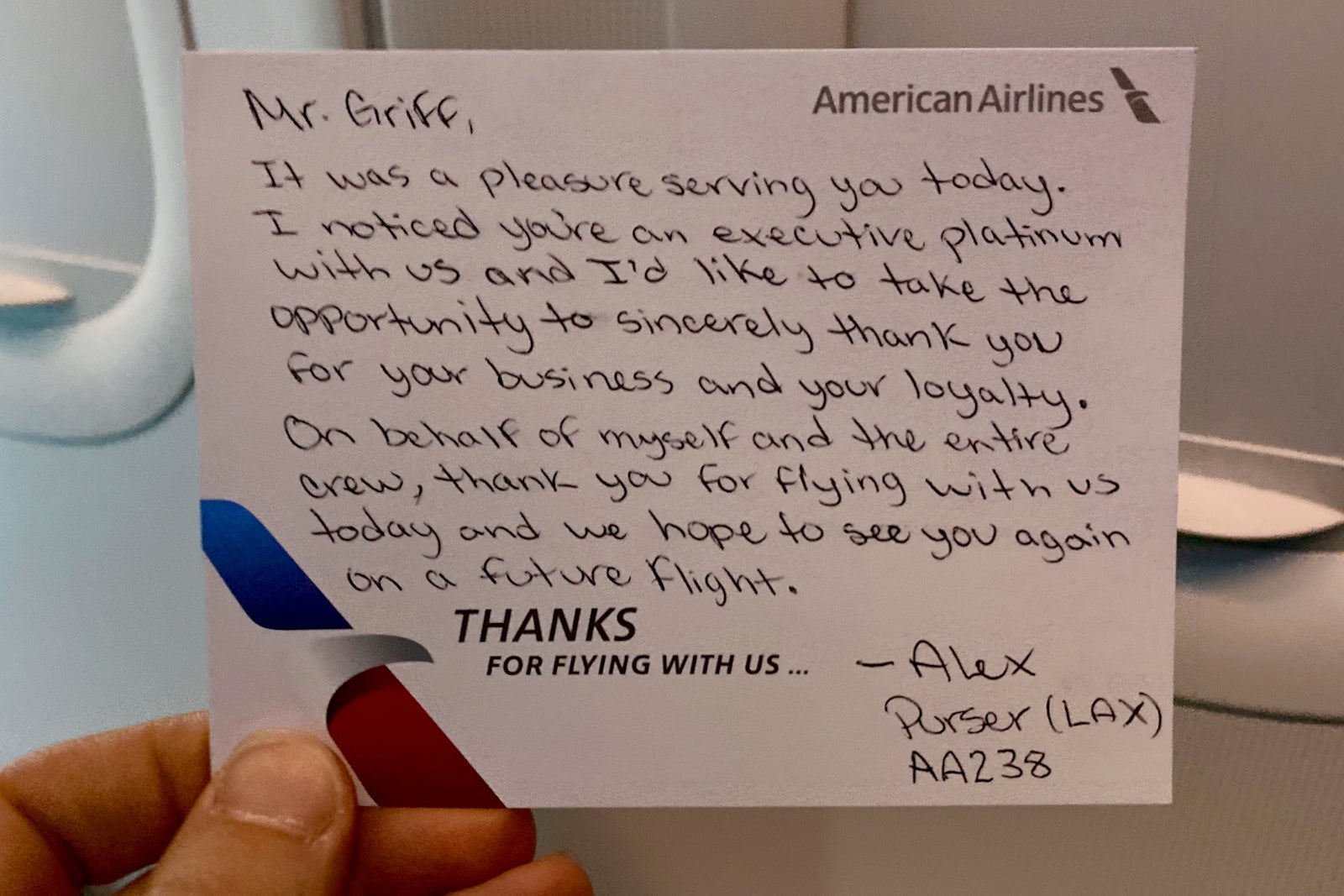 The lead flight attendant continued to check on first-class passengers throughout the flight and responded immediately to the call button. At the end of the flight, he handed out handwritten cards thanking each passenger for flying with AA.