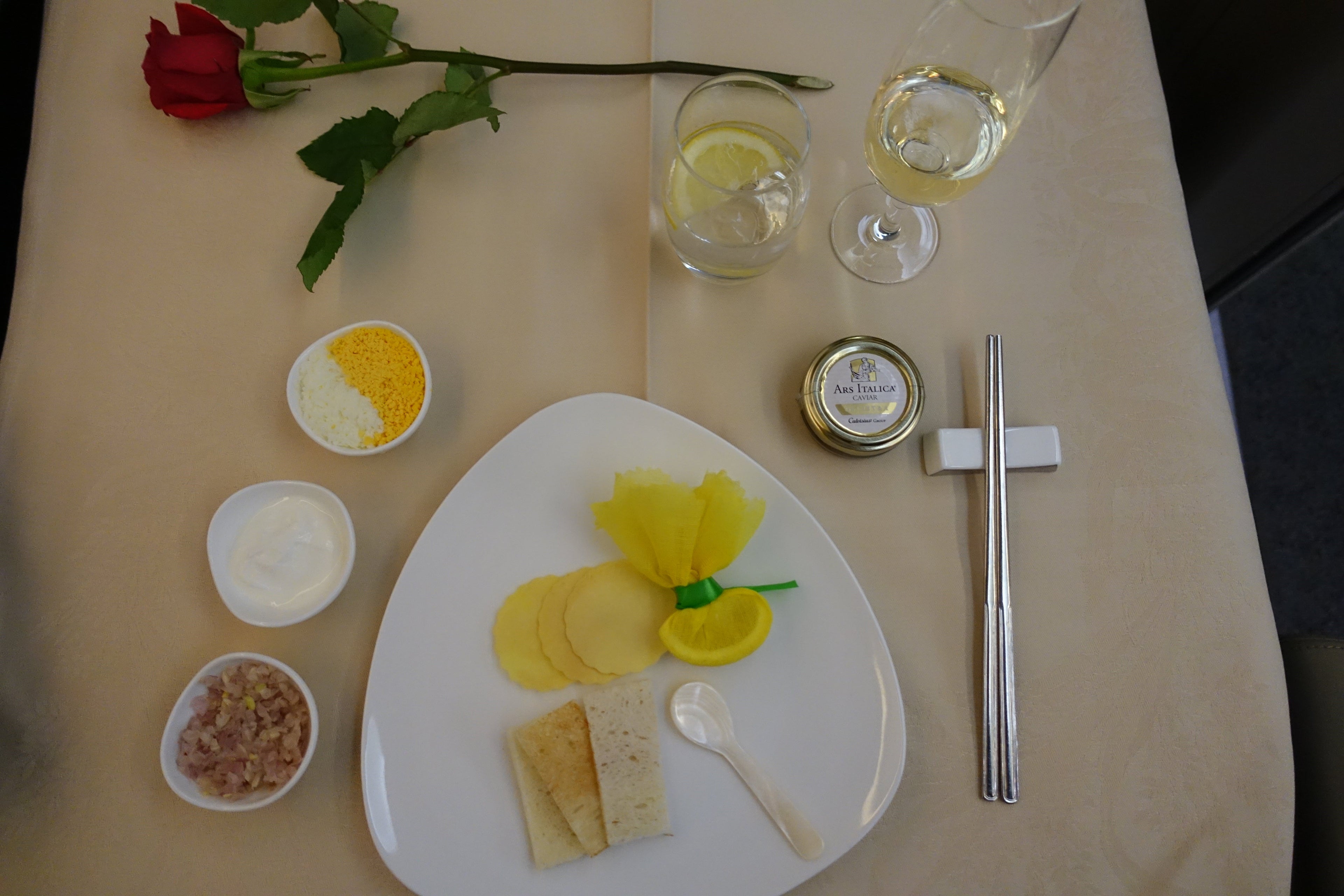 The meal began with some delicious Ars Italica Caviar, served with a single red rose laid dramatically on the table (unlike Lufthansa's upright rose in a mini-vase).