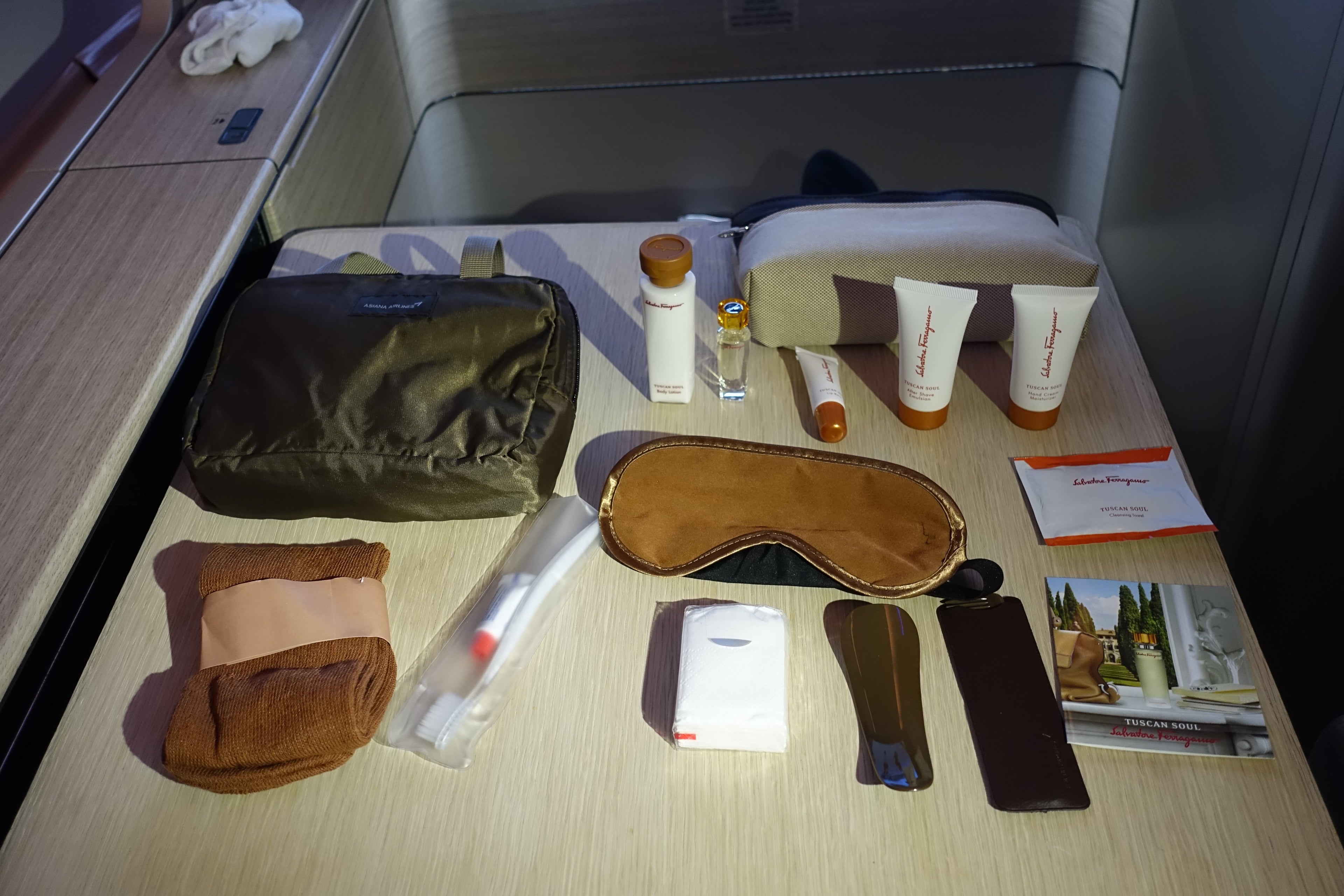 My suite came outfitted with a large pillow and blanket, as well as slippers and pajamas for sleeping. I loved the Salvatore Ferragamo amenity kit, which feaured earplugs, socks, an eyemask, hand cream, perfume and even a small shoe horn. A small duffel bag was also provided so I could easily carry everything with me.