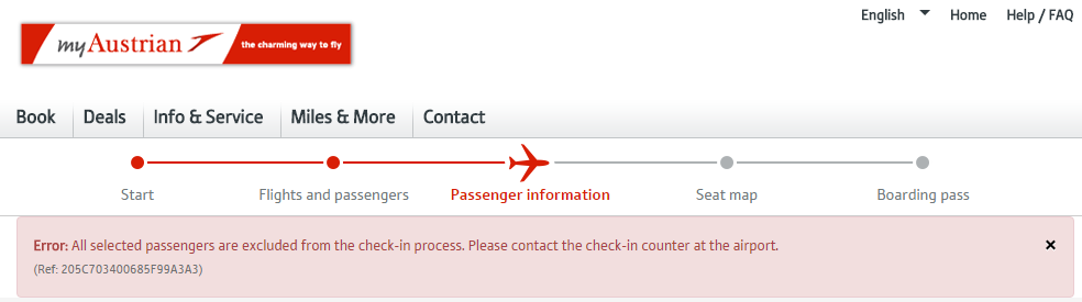 With this number, I obtained my record locator on Austrian Airlines and completed most of the steps to check in before receiving an error message that read, "All selected passengers are excluded from the check-in process." On a hunch, I removed my middle name — which had auto-filled in the first-name box — and was finally able to check in successfully.