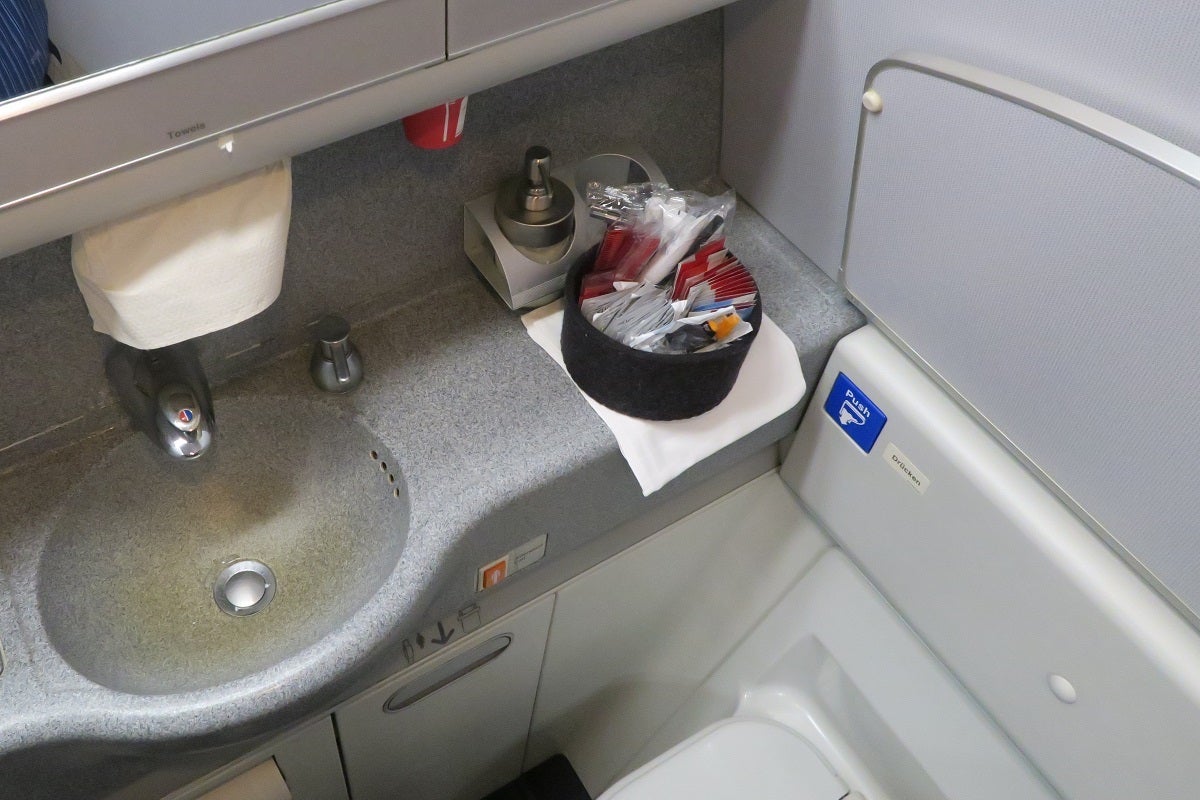 The business-class bathrooms were unadorned but offered a basket of amenities: moist towelettes, earplugs, a stain-remover wipe, plastic-wrapped combs and a full shaving set.