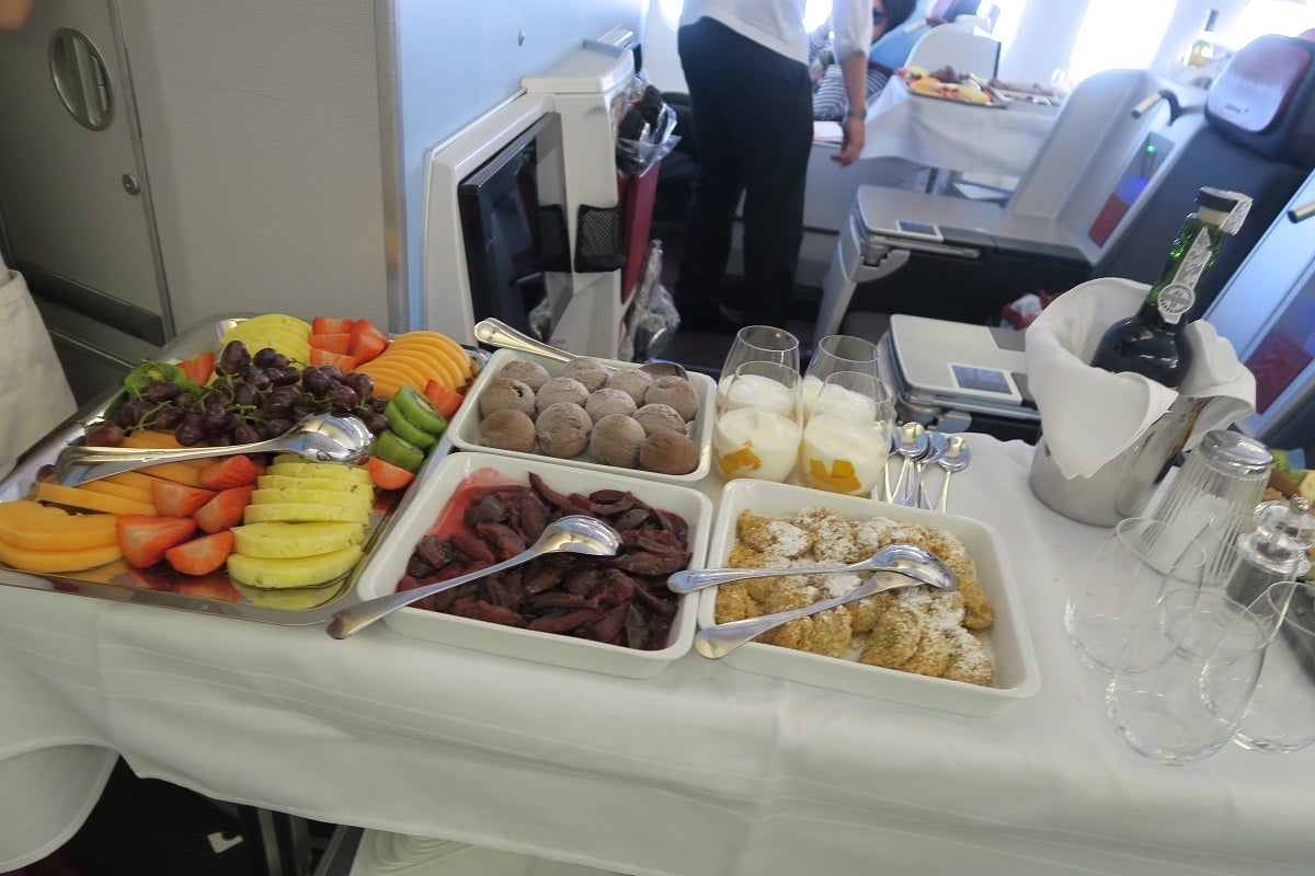 The fourth and final service of lunch was dessert: a choice of cheeses, fruits, "traditional sweet dumplings" (plums and chocolate-filled pastries), marinated mango and a "homemade chocolate parfait." The cabin crew recommended the traditional pastries along with an accompanying glass of award-winning dessert wine. Along with the Austrian treats, I sampled the chocolate ball, cheeses and nuts — along with another recommendation to have a glass of port.