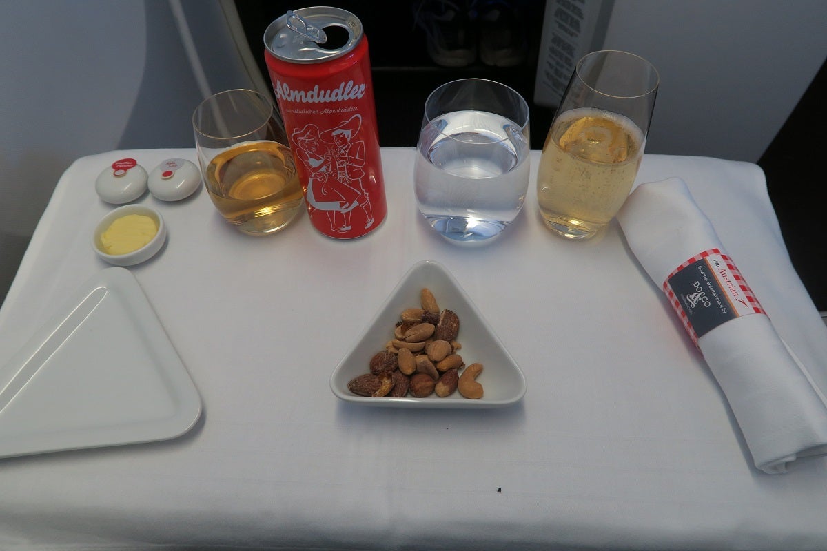Around 20 minutes after takeoff, a warm towel service preceded the first food/drink service, which offered mixed nuts along with a selection of sodas, juices, still and sparkling water, wines and Champagne. Intrigued by the design on one of the soda cans, I decided to try out the "special Austrian ginger ale" called Almdudler — along with a glass of Champagne and a glass of water.
