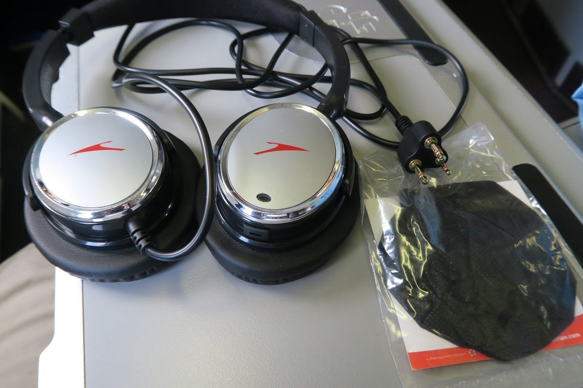 Seats were stocked with a pair of high-quality, Austrian-branded, noise-cancelling — and quite comfortable — three-prong headphones. There's no indicator of the manufacturer of the headphones, which is a bummer, as I might actually consider buying a pair. The IFE system has a three-prong audio output, so while you can plug standard headphones into one of the prongs, you're only going to get sound in one ear — if you'd like to be able to use your own headphones effectively, you'll need to bring along an adapter.