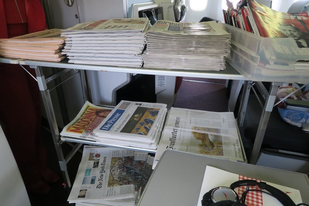 During the online check-in process, I received this invitation: "To go straight to your free travel reading, click this way." Intrigued, I clicked through to see what was offered. Once there, this message appeared: "You have used up all of your free downloads." The only free publications remaining were Austrian's onboard magazine and the in-flight shopping magazine, while other options were available for €0.99 to €3.99. I took this as a sign of cost-cutting and figured there'd be no reading material onboard, but that wasn't the case. During taxiing, the cabin crew pushed a cart of newspapers and magazines — available in English and German — through the cabin.