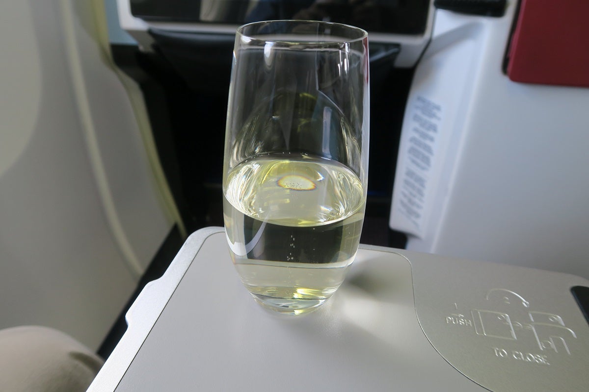Service began during boarding, with a crew member dressed as a chef handing out menus and taking our meal orders before the aircraft door was even closed. A welcome drink — your choice of orange juice, Prosecco or another cocktail — was served after the last economy passenger had boarded the plane. The flight attendant stuck to these choices and wouldn't open a bottle of white wine for the passenger behind me.