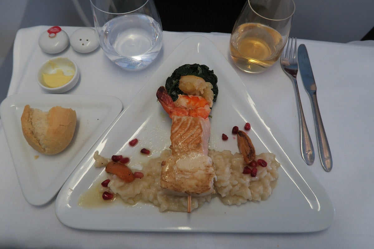 15 minutes after the soup service was the main course. The main dish was a choice of "miso glazed short ribs, caramelized pineapple, fried sushi rice," "seafood brochette with butterfish/salmon/prawn, risotto with pomegranate seeds" or "truffled rigatoni with creamy mushroom sauce." When the chef took main-dish orders during boarding, I chose the seafood option in a hurry but didn't end up regretting it. The fish was wonderfully cooked and the risotto and pomegranate seeds tickled the palate with completely different flavors than the seafood.