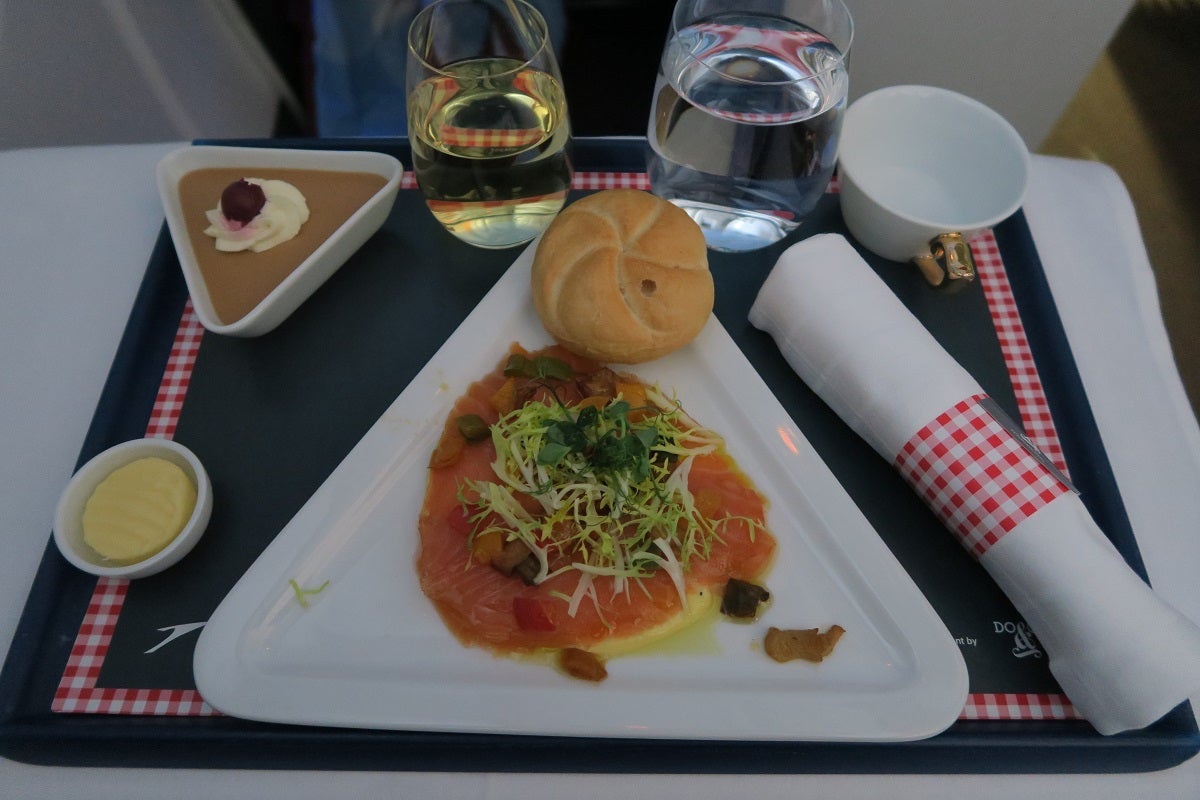 After slightly less than five hours of rest time, it was time to eat again. The "second service" was a choice between two smaller plates: "smoked salmon with sauce Claudio and ratatouille" or "veal carpaccio with wasabi crème fraîche and beetroot." Sticking with my seafood theme, I ordered the salmon. The flight attendants recommended a glass of Riesling to complement the dish.