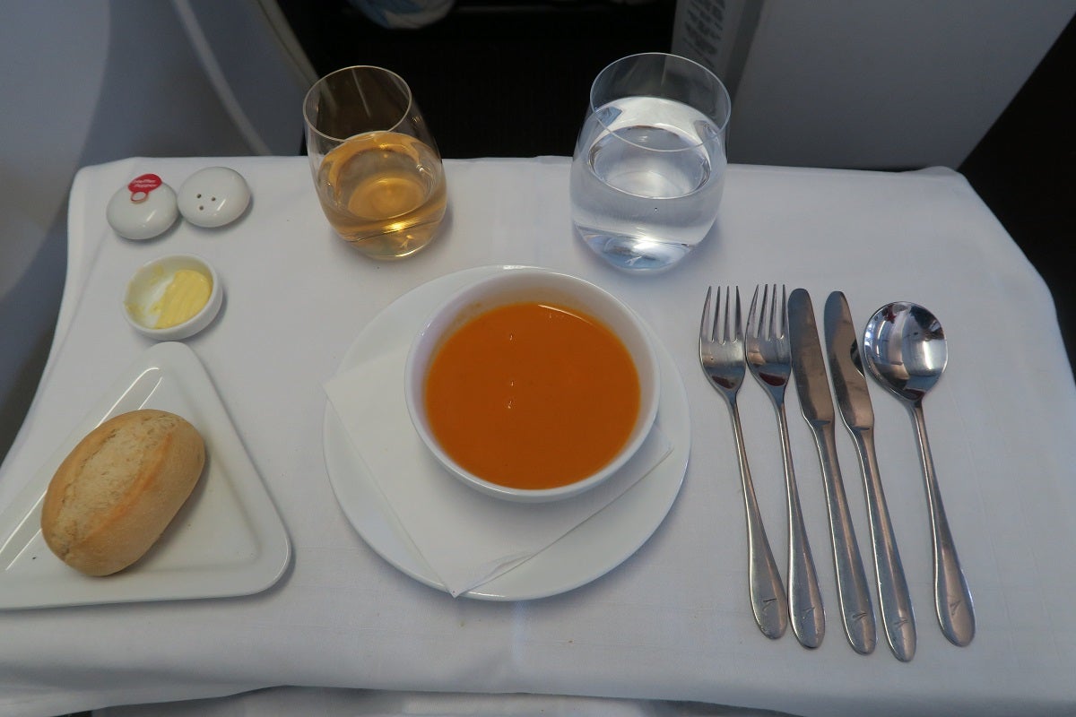 About 20 minutes after the first service, the crew began the meal service. It featured a luxury I hadn't yet experienced; everything but the main dish was plated seat-side from the trolley. Appetizers were a choice among smoked salmon tartare, octopus salad, a Spanish-style ham and cheese, cottage cheese with chives and cherry tomatoes, grilled vegetables and mini-potatoes with butter and bacon. Although all the options looked delicious, I limited my ordering to just the salmon, a potato, octopus salad and ham. None of them disappointed. The service was complemented by a selection of warmed rolls and crackers.