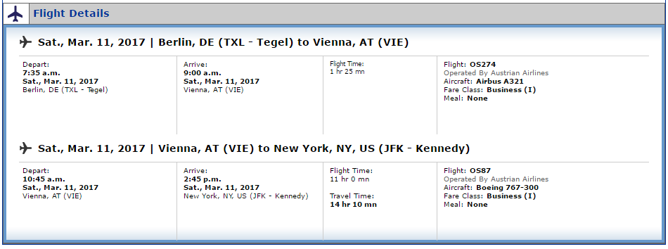 I was looking for options to fly back to New York from ITB Berlin, a massive travel trade show, and award availability was understandably tight. However, thanks to Austrian Airlines' generous award availability, I was able to find business-class seats from Berlin (TXL) through Vienna (VIE) to New York (JFK) for 70,000 United MileagePlus miles and $112 in taxes and fees.