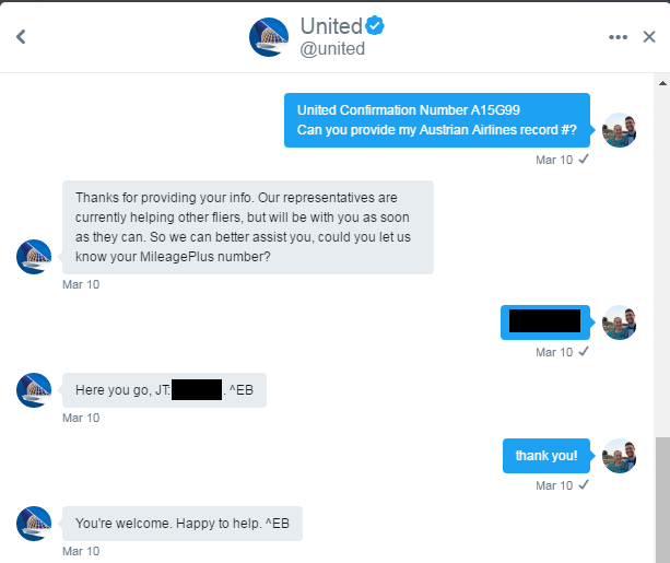 I contacted United to get my Austrian Airlines record locator so I could access my flights. To avoid international calling prices (even at just $0.20 per minute), I direct-messaged United on Twitter and got a personalized response with my record number within eight minutes.