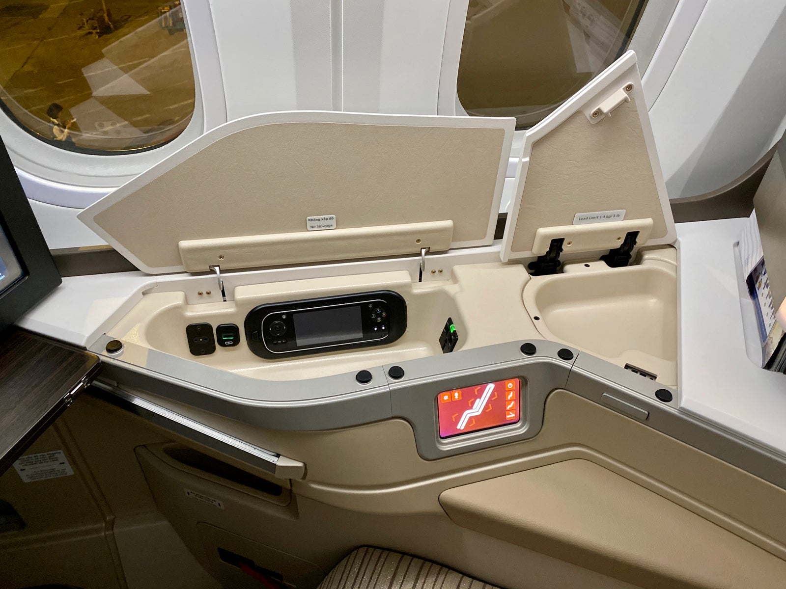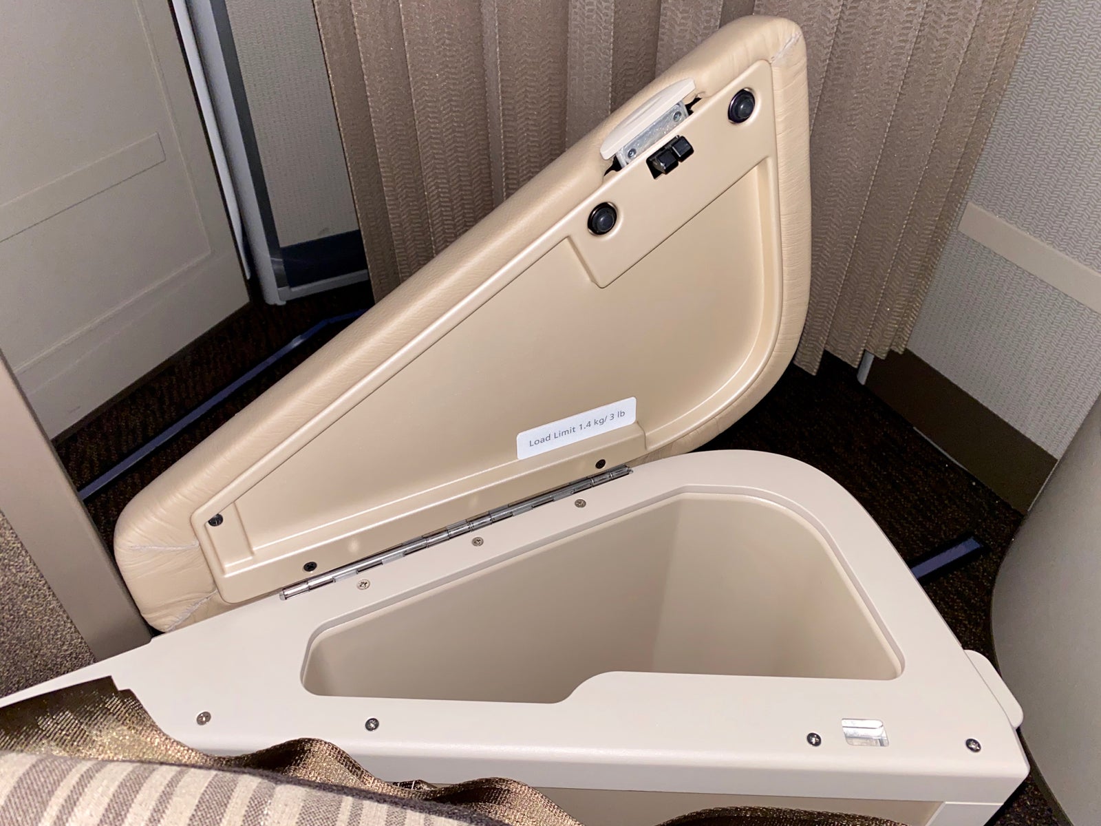 There are two enclosed storage compartments located along the side of the seat, and one features an IFE remote, power outlet and USB port.