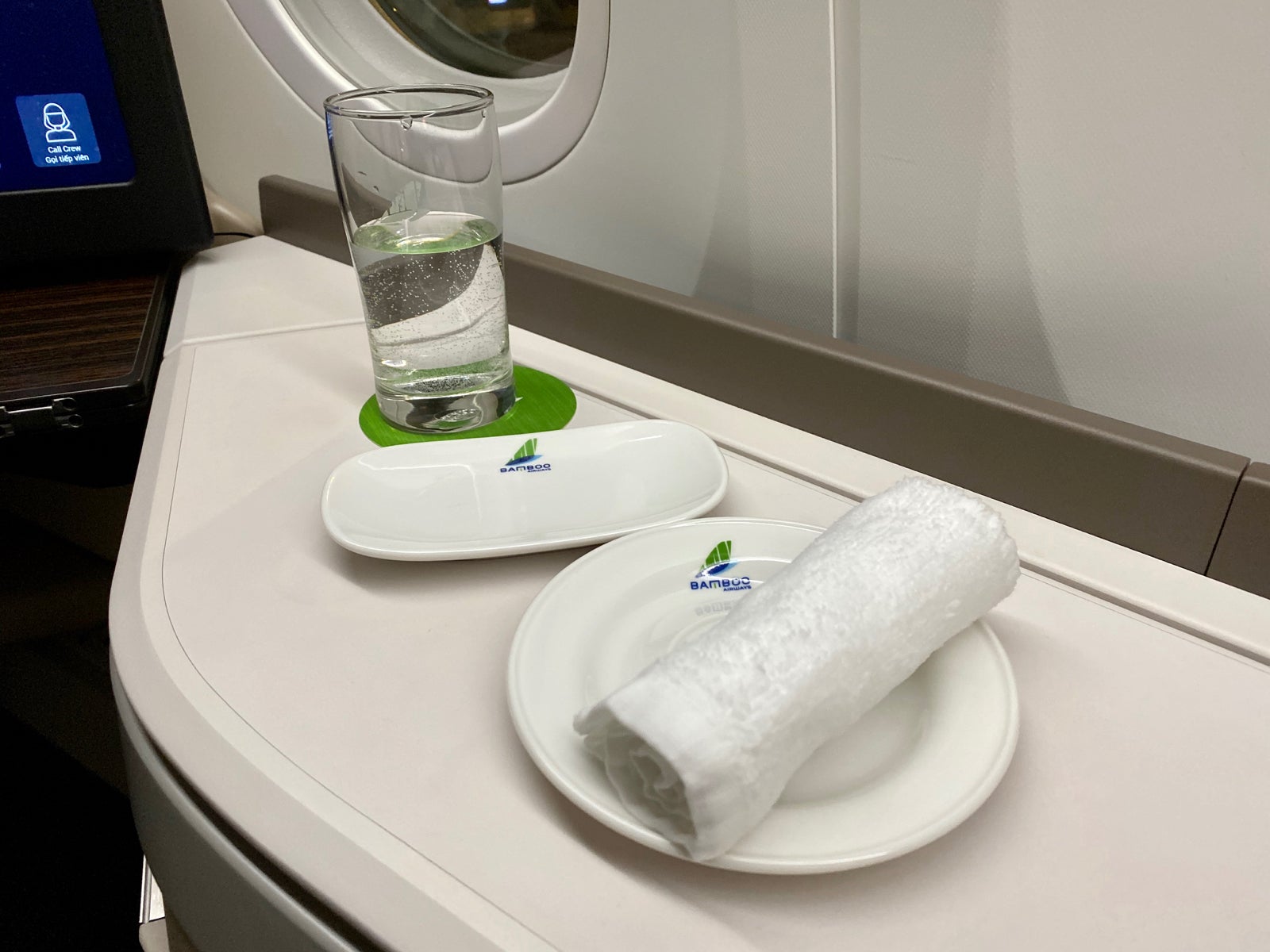 Service began with cold towels and predeparture beverages of choice. I really liked the Bamboo Airways tableware, which was nicely embossed with the airline's logo.