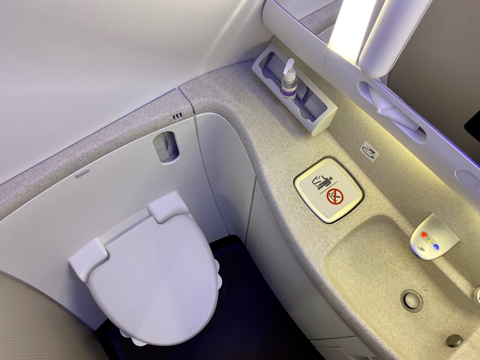 The bathrooms, of which there's only one dedicated to biz, is of the standard Dreamliner variety. However, the shared one between biz and premium economy features a window.