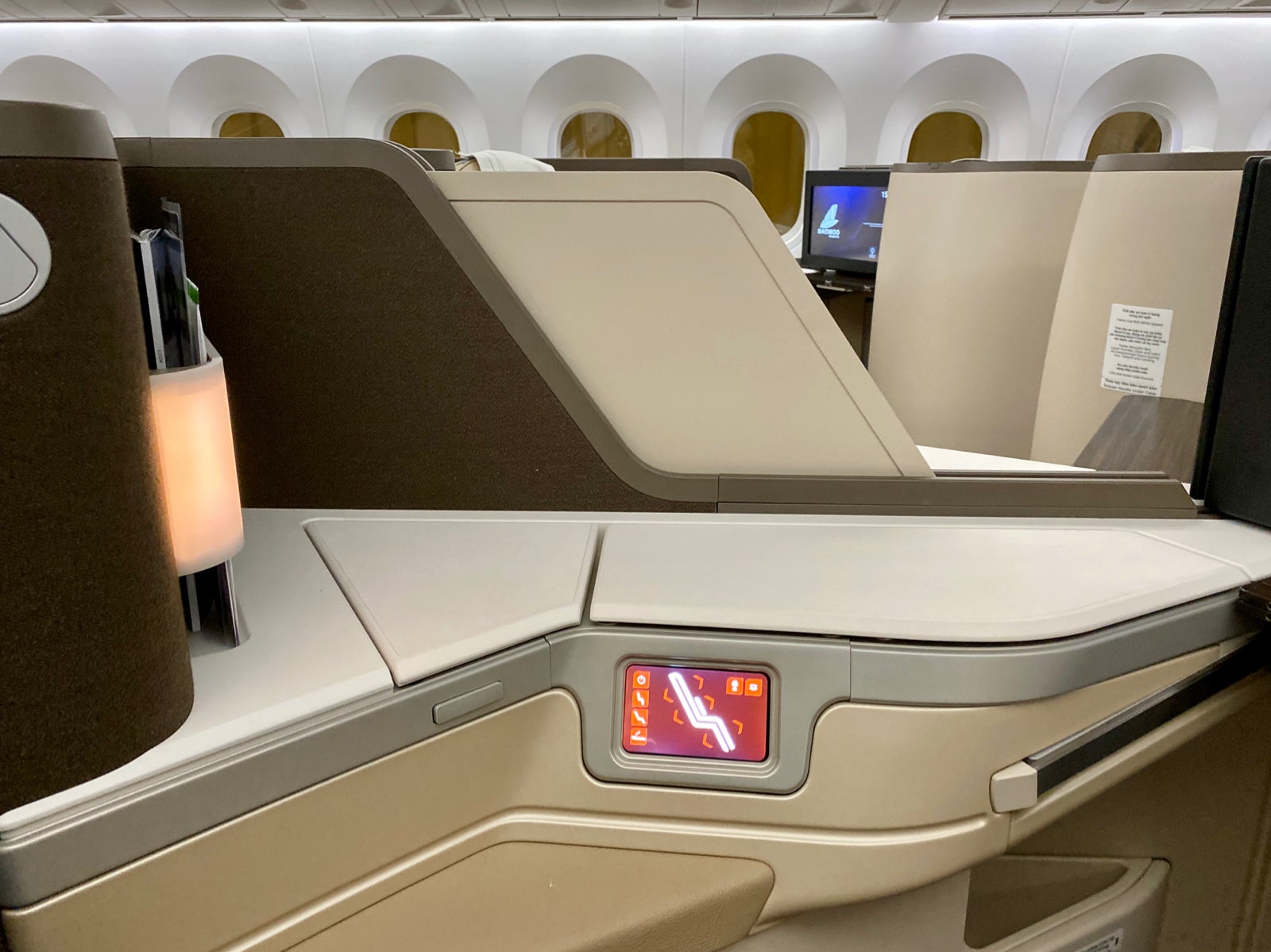 The literature pocket is exposed on the side, next to the well-placed accent lamp. The IFE screen measures 18.5 inches, and is very crisp. Unfortunately, since the plane is so new, the IFE software hasn't been loaded yet.