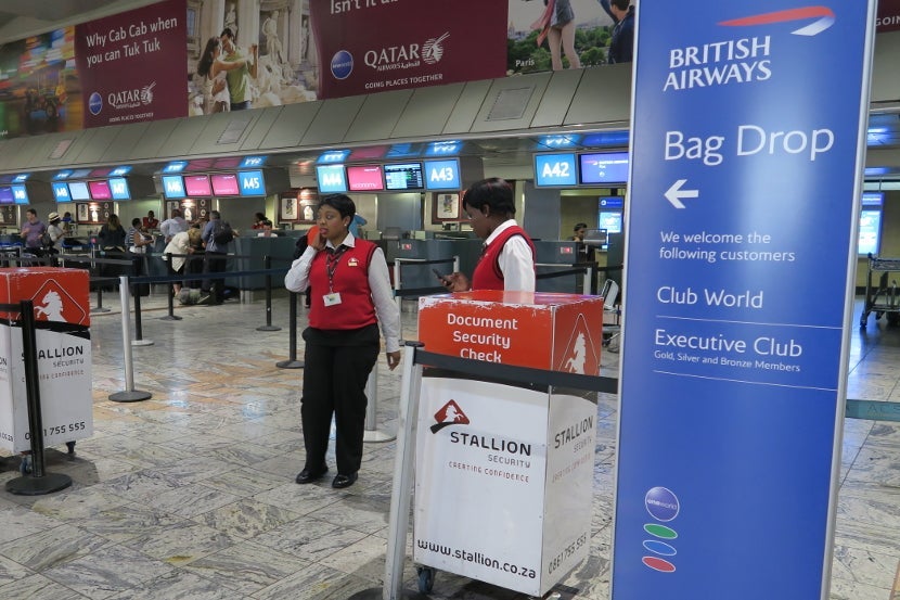 Contract security staff checked your documents before allowing you to approach the bag drop counter.