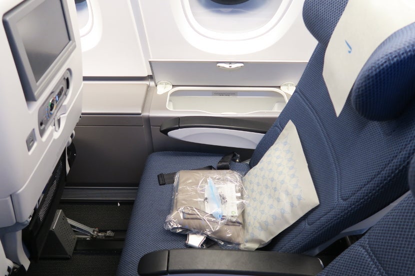 A pillow and a packaged blanket, toothbrush, toothpaste and earbuds awaited each passenger at their seat. I found these earbuds provided good enough sound quality to discourage me from retrieving my own headphones from my carry-on bag.