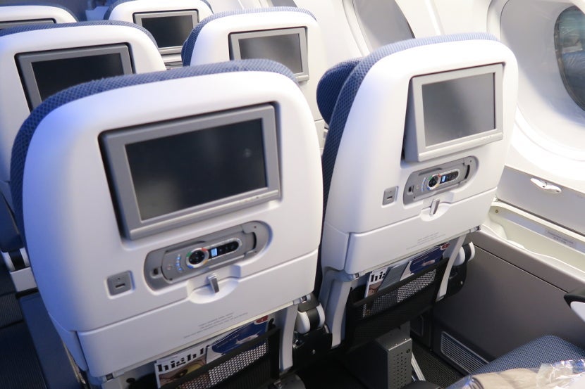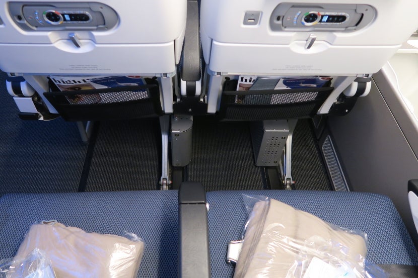 One downside of the window seats upstairs is that an in-flight entertainment box is placed in the middle of your leg space, and it would have been difficult to put anything of size — like a daypack or duty free bag — under the window seats due to the placement of this box. With a 31-inch pitch, I expected that this entertainment box would significantly impede my legroom, however I found that despite this box, I was generally comfortable enough because I could put my feet on either side of it.