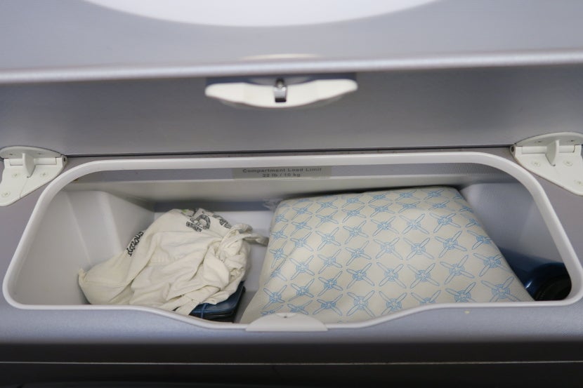 The storage compartment beside my 74K seat ended up being much deeper than I expected. It easily fit all the belongings I might want during the flight, including my laptop and the provided blanket and pillow. Strangely, but likely to prevent bickering between passengers, every window seat had only one bin — all of the additional bins were locked and in order to open them, you had to push down lightly on the lid. One annoyance was that the passenger behind me kept trying to sleep with his foot on my bin, which prevented me from opening it until he moved his foot.
