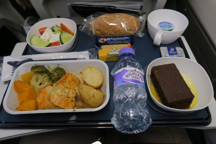 Dinner was served one hour and 40 minutes after take-off. The meal started with a salad that was fresh and tasty — outside of a few pieces of wilted lettuce at the bottom of the salad — as well as room-temperature plastic-wrapped bread and commercially packaged crackers and cheese.