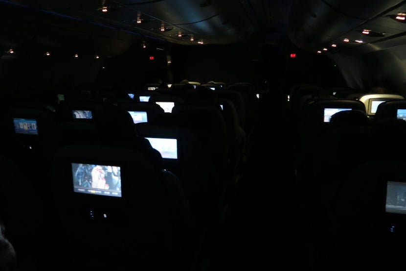 One of my favorite features of the A380 cabin was the lighting. All lighting changes in the cabin took place very gradually. After dinner the lighting in the cabin simulated a sunset and darkened until the cabin was completely dark. As dawn approached before breakfast, several light blue ceiling lights became illuminated. Shortly before breakfast, light pink lights illuminated near the windows to simulate a sunrise. The changing lighting was very peaceful and gradual enough to have likely gone unnoticed by most passengers.