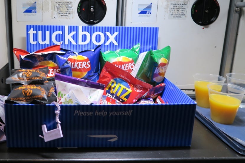 I visited the rear galley multiple times during the night to stretch and obtain drinks and snacks. The flight attendants had set up — and seemed to replenish throughout the night — a snack box as well as a few trays of water and juices. Each time I visited the galley two flight attendants were present. In each case, they seemed surprised to see me. Despite this, they offered to get me anything I needed — but I almost felt like I was intruding when I stood around for an extended period of time and stretched.