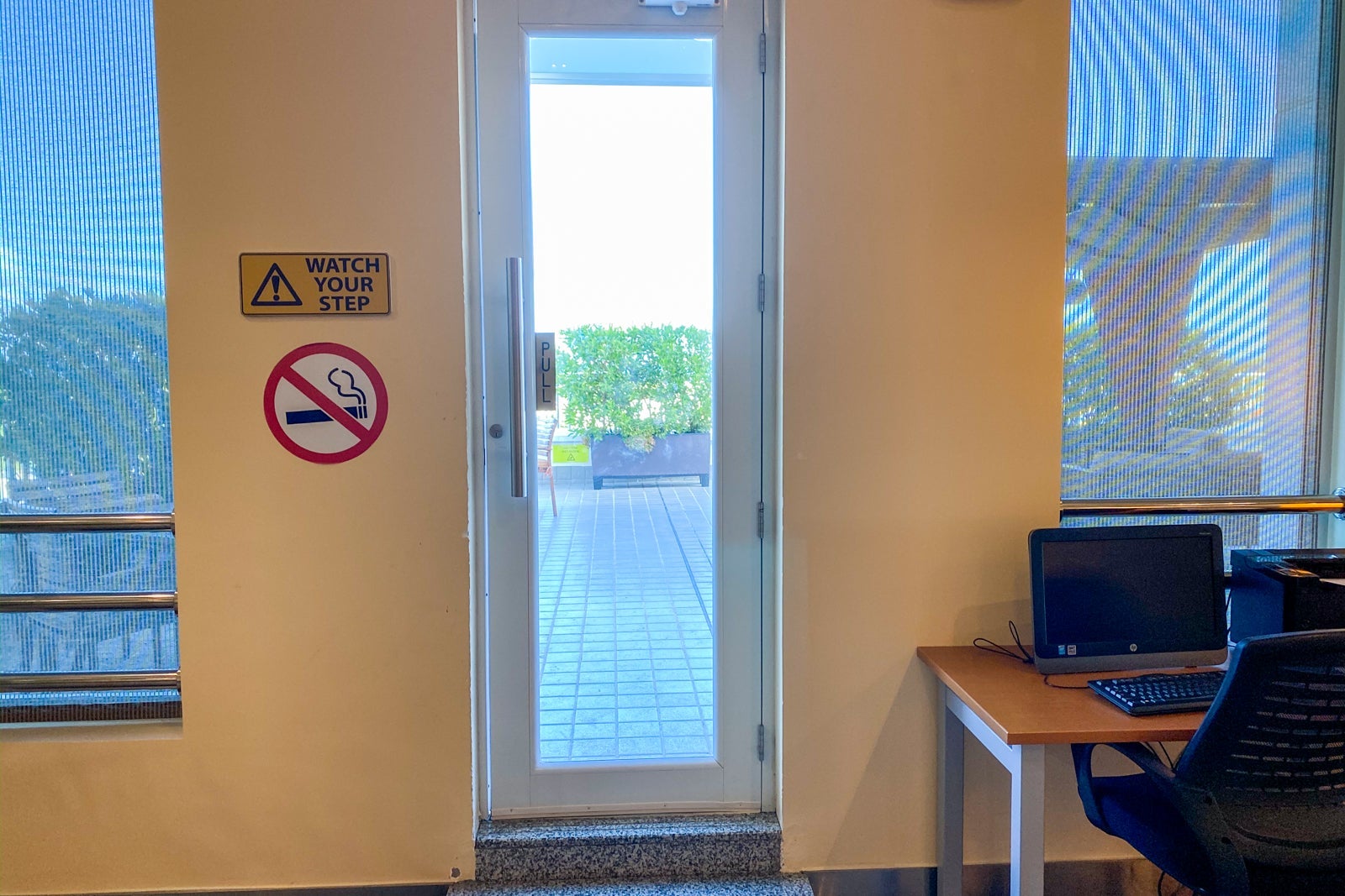 The lounge was basically one large rectangular room with a bunch of recliner chairs. There were a few outlets scattered around the walls.