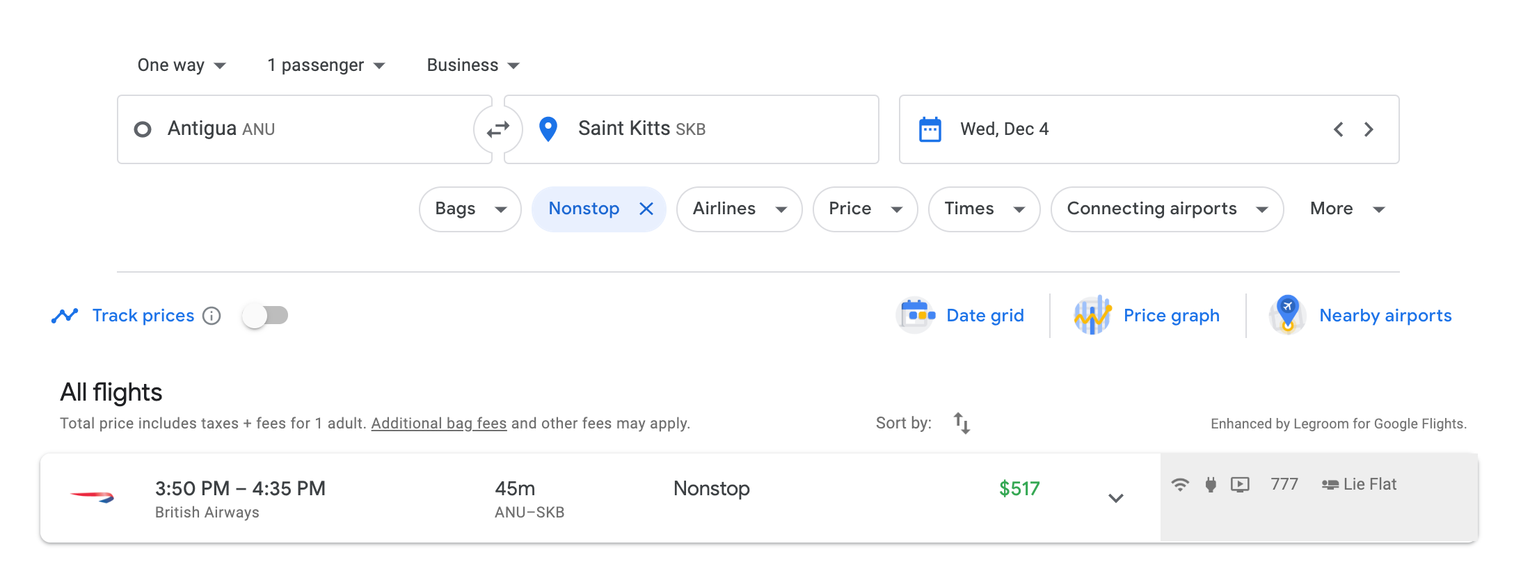 Booking this flight was simple. Google Flights displayed the flight schedule and price along with all the other airlines operating this route. I knew to look for this flight, but you may stumble upon some of BA's other Caribbean flights during your searches.