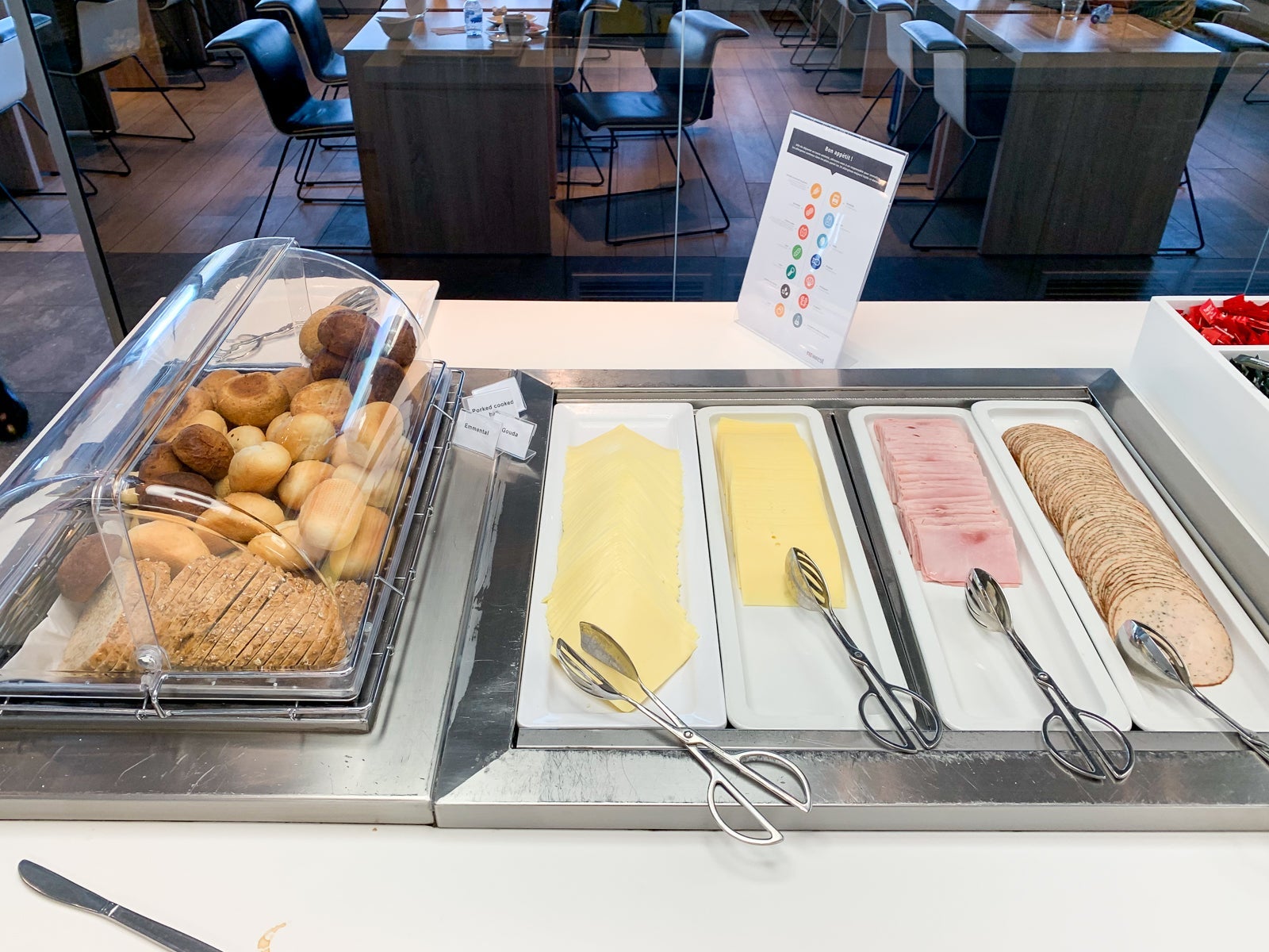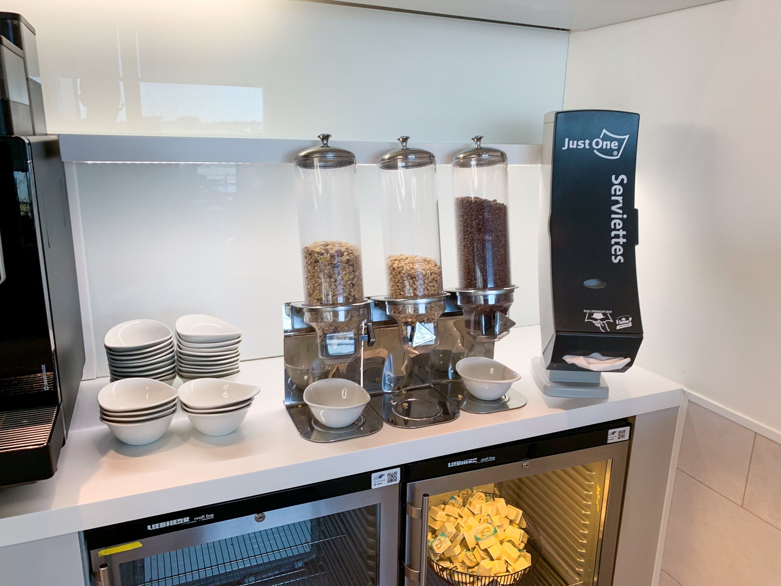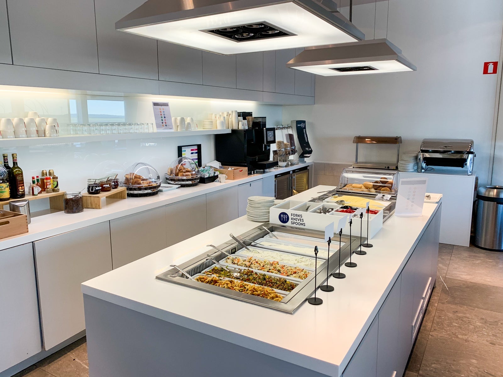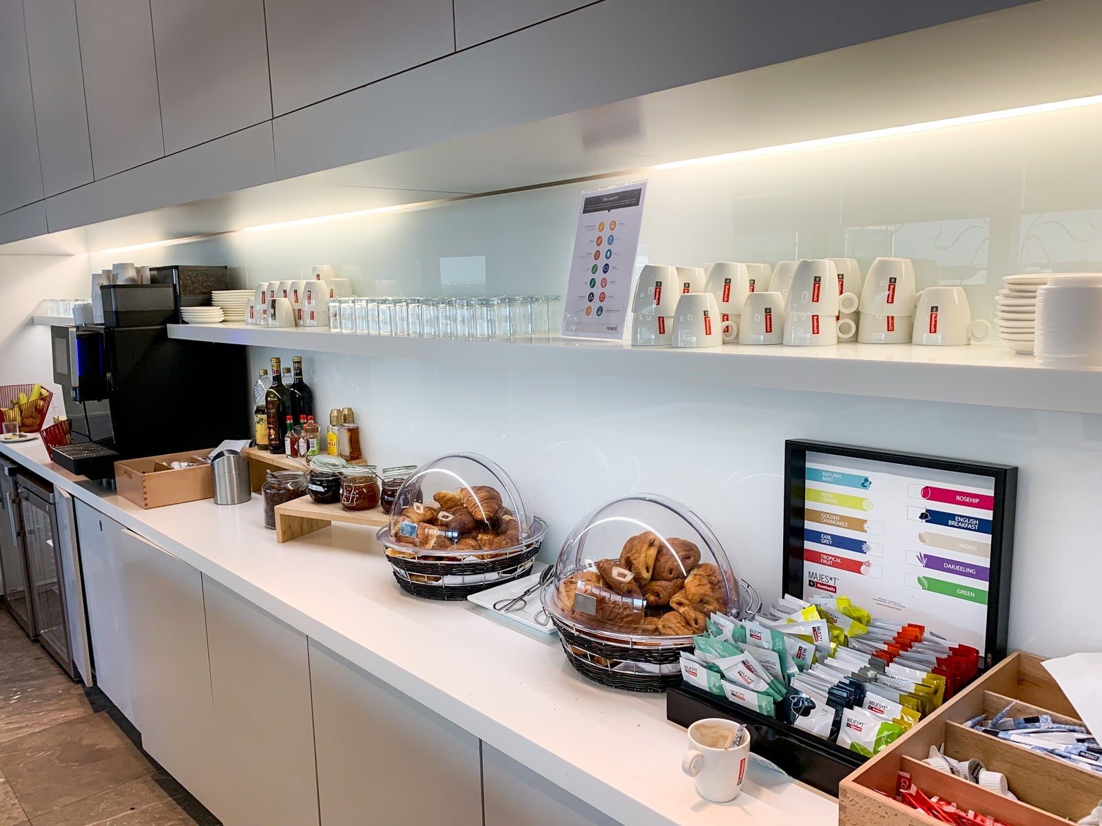 For an international business-class lounge, the continental breakfast spread was unimpressive.