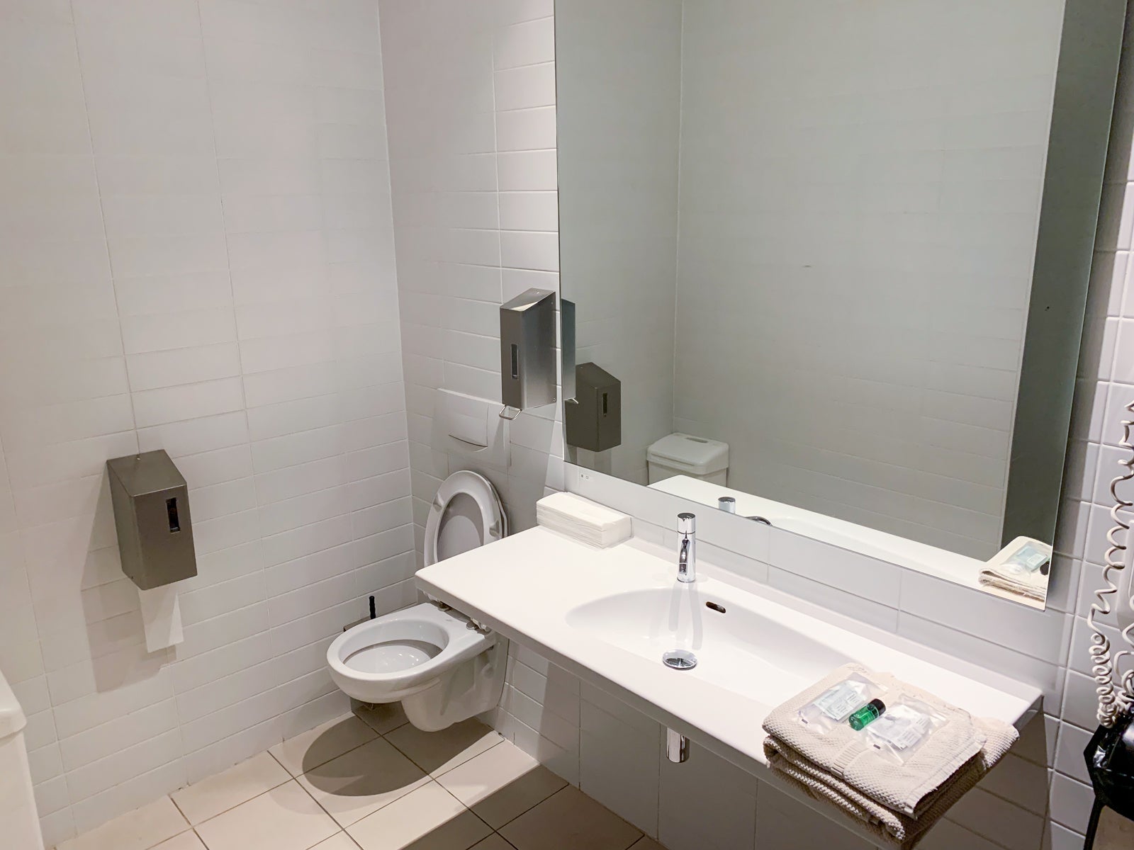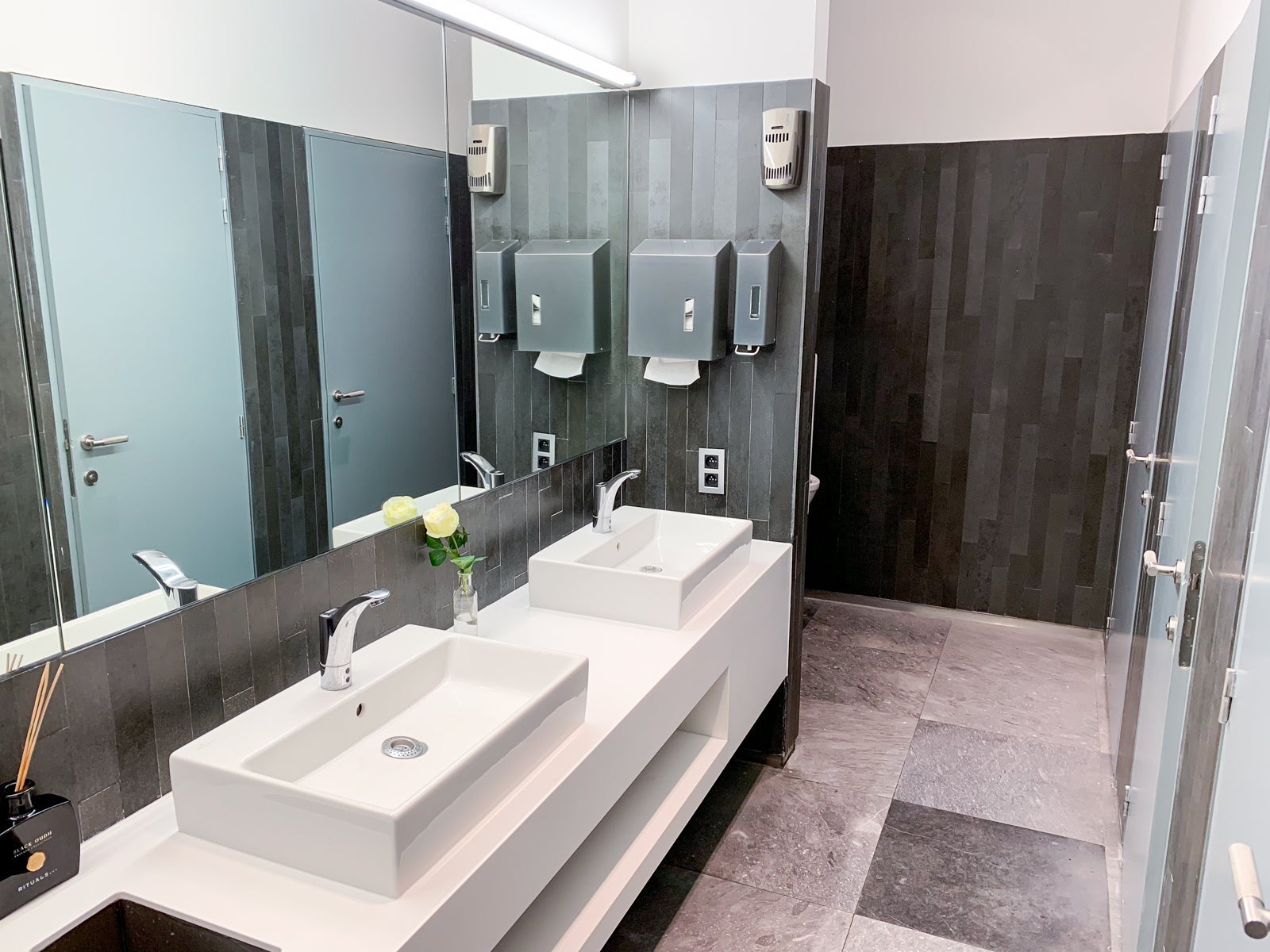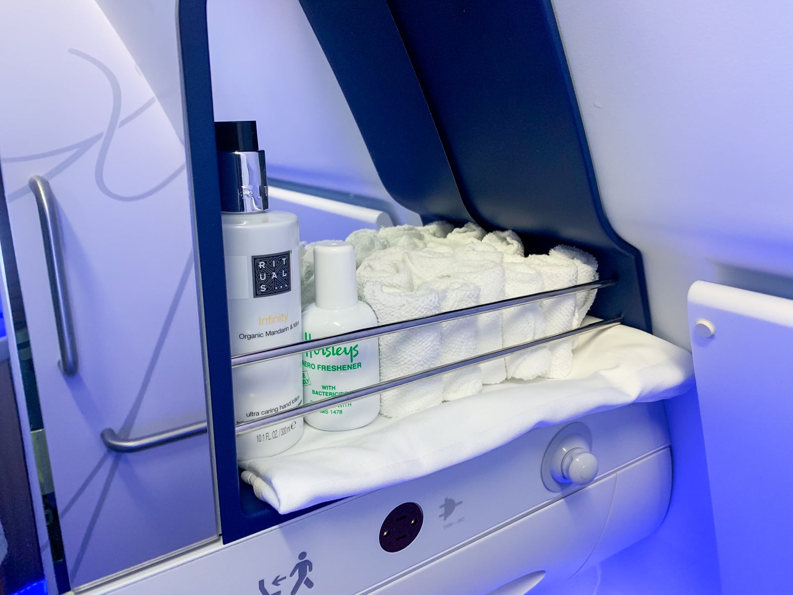 There were two bathrooms for the 30 passengers in business class: one in the front by the cockpit and one in the back by the premium economy cabin. Neither restroom had any special features other than Rituals hand cream and single-use cloth towels.
