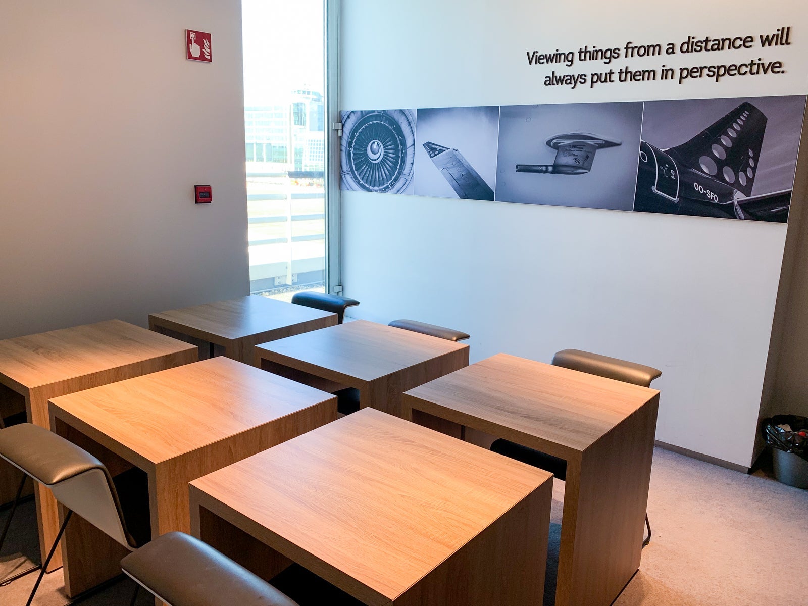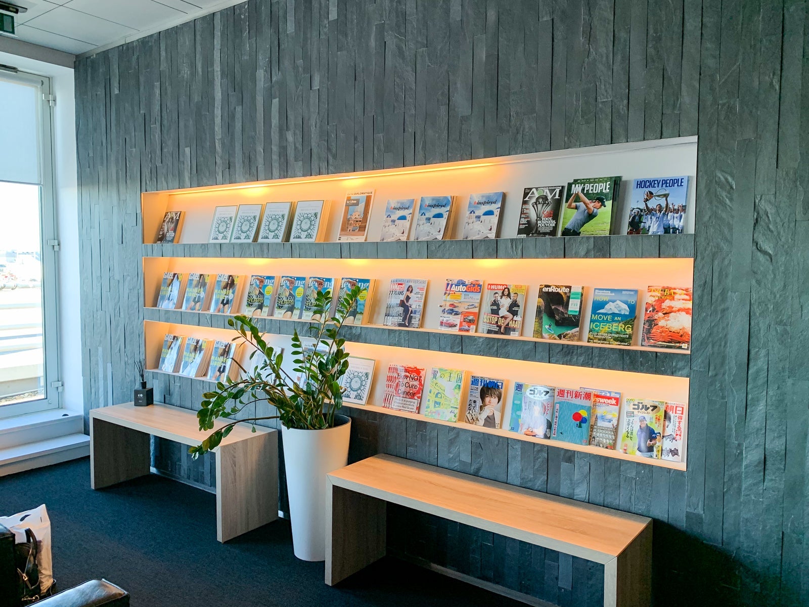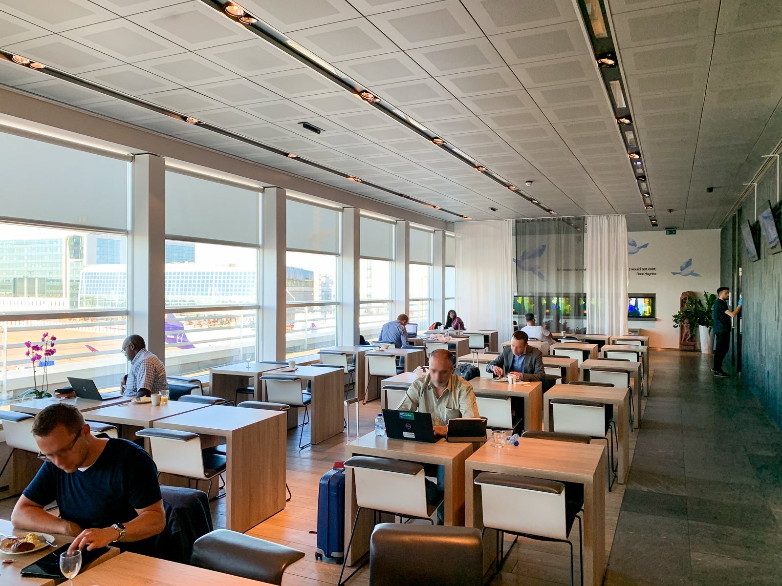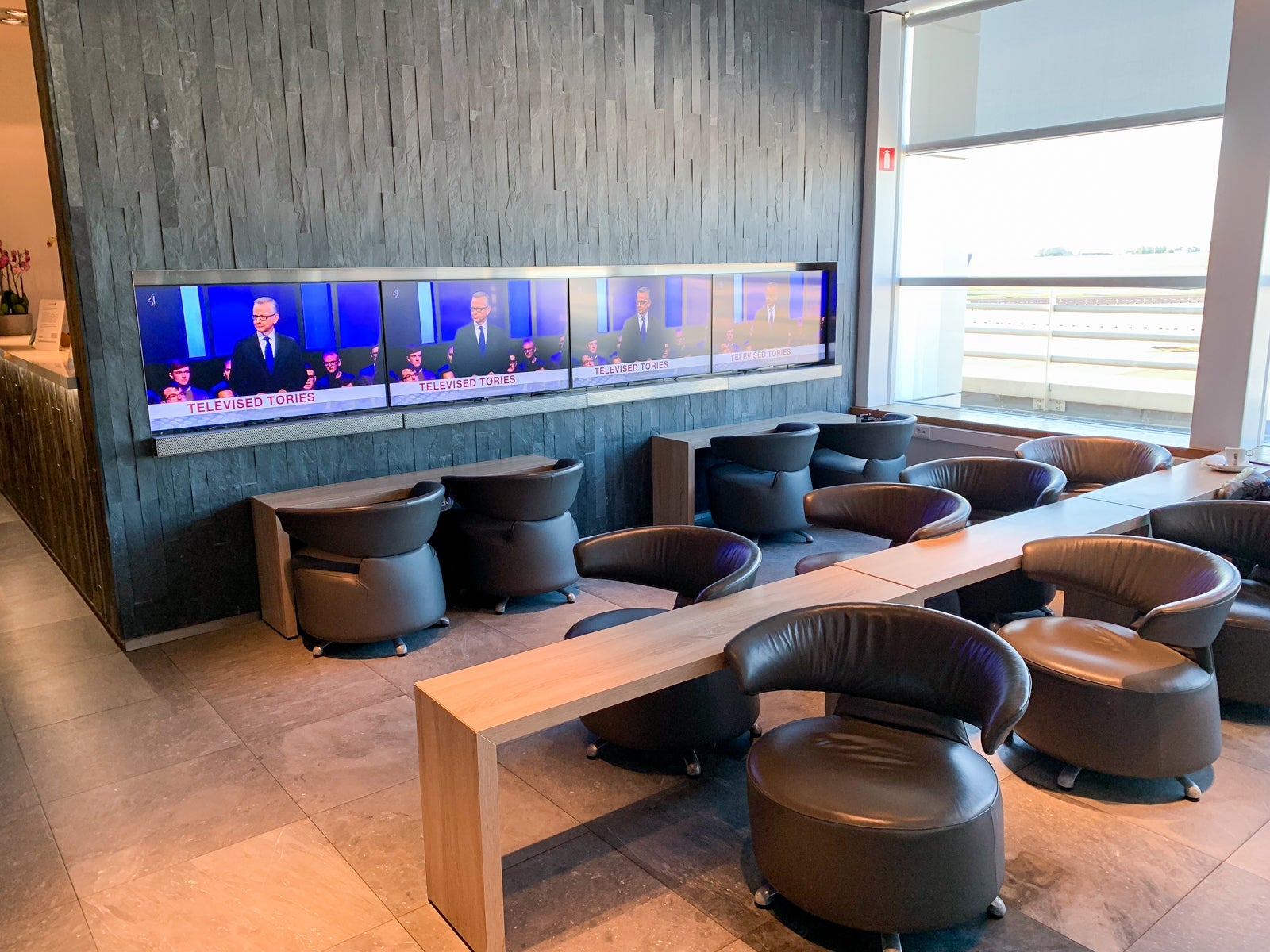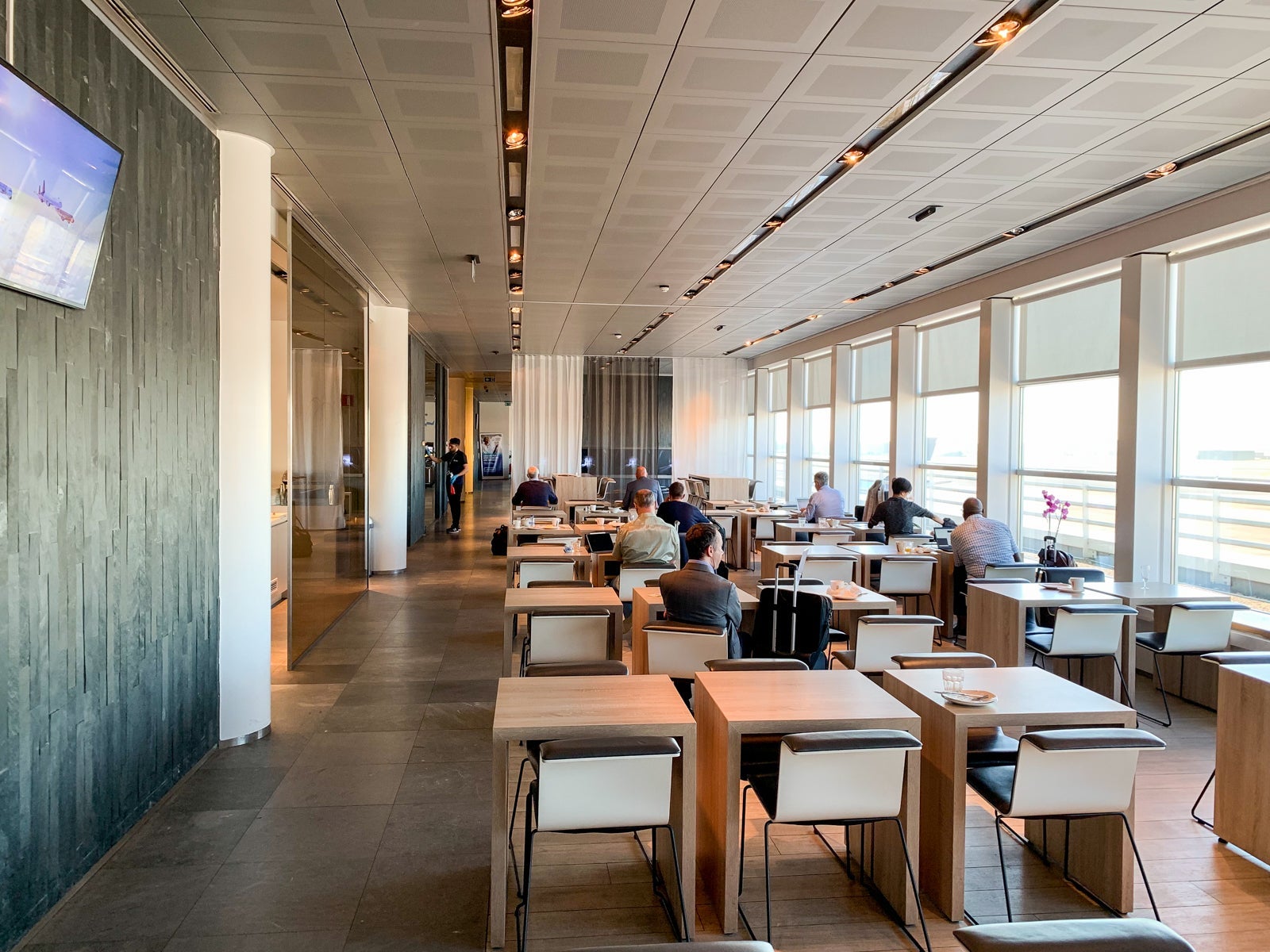 The lounge was shaped like an especially long and narrow rectangle with sweeping apron and runway views. There were two main sitting areas, one to the left of the entrance desk and the other to the right of the desk.