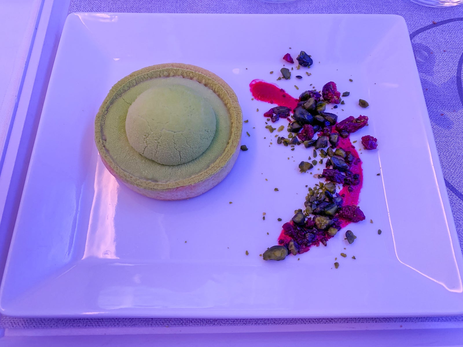 The cheese and dessert cart finally rolled through the aisles a full two and a half hours after takeoff. I loved the dessert from the regular menu, a pistachio tart with lime and ginger.
