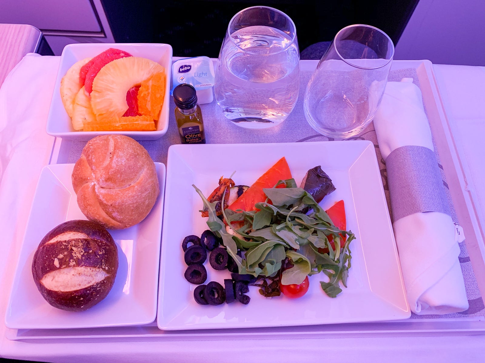 The experience is definitely an evolution from the previous product. The hard product and cabin finishes have both been updated, but the amenities and IFE are still very much version 1.0. Sure, the food and beverage choices are impressive, but you can find the same cuisine on flights operated by the older planes.