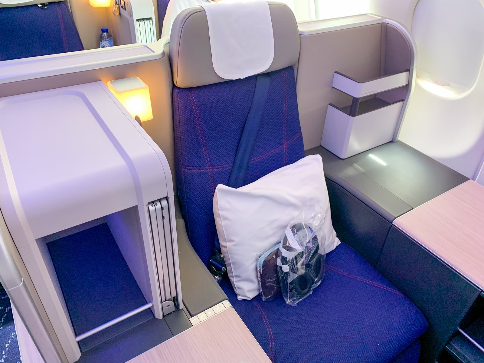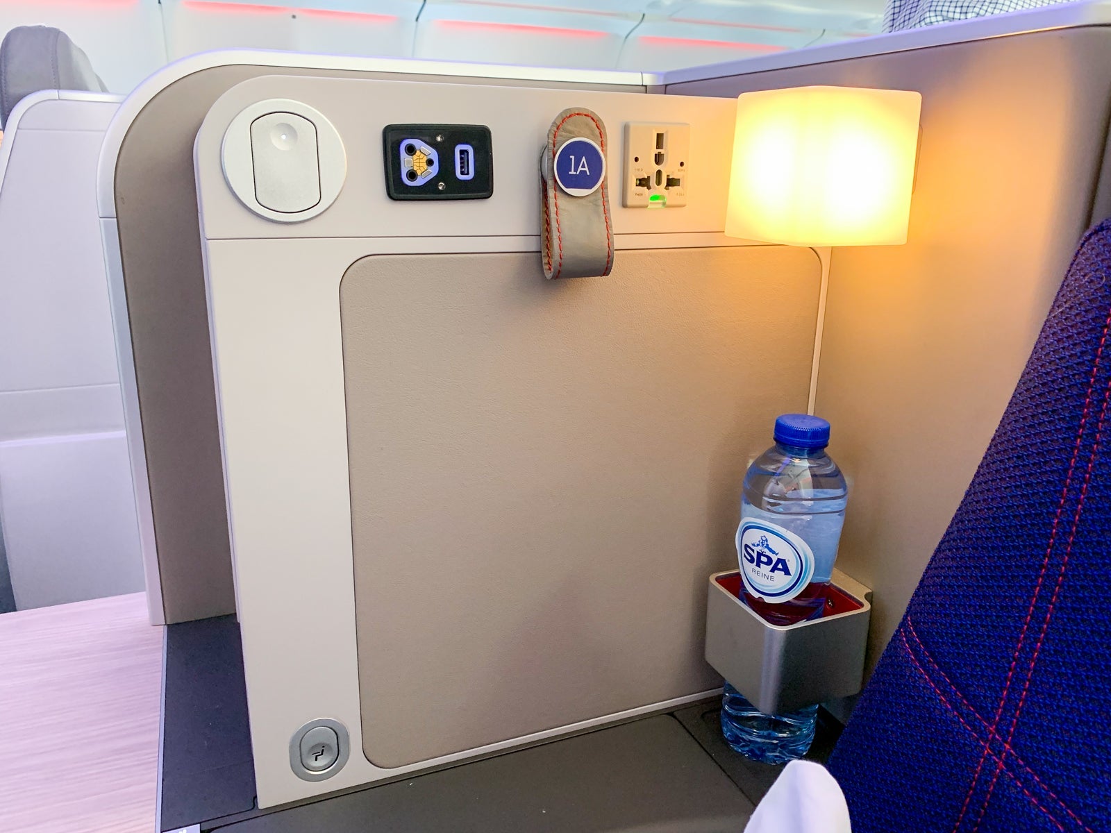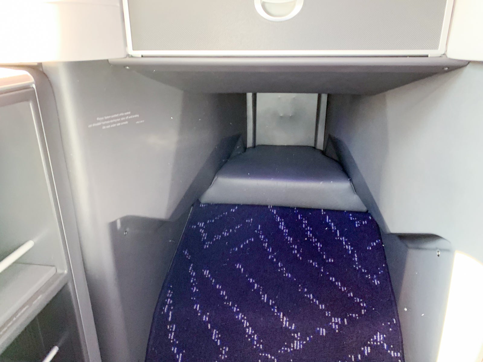 I was seated in 1A, the bulkhead throne that offered an extra storage compartment on the floor as well as an oversized footwell.