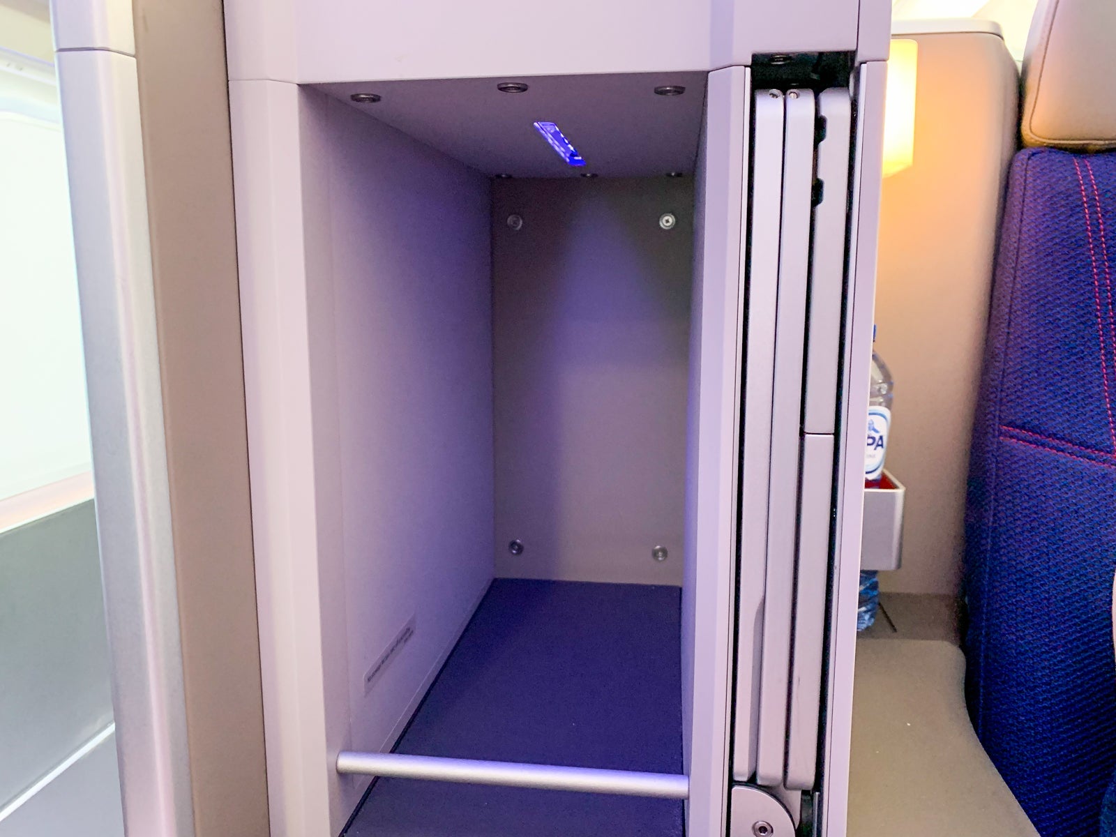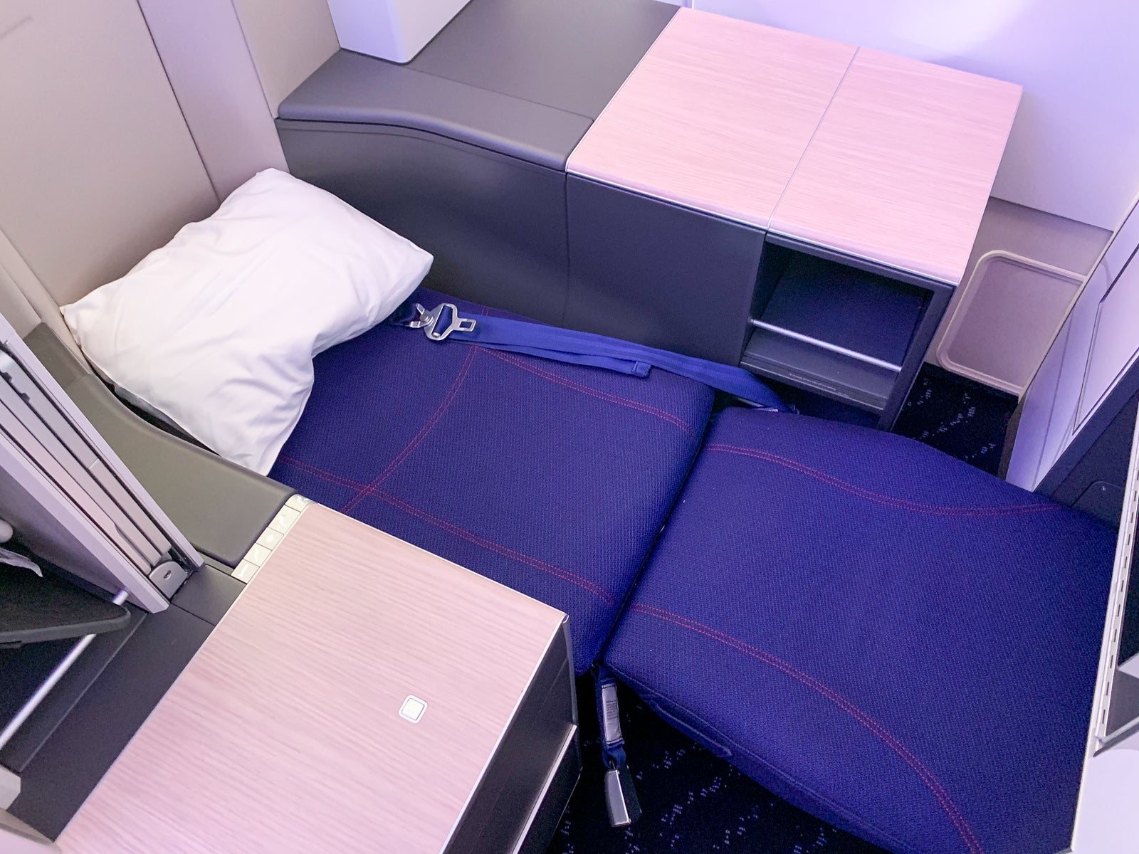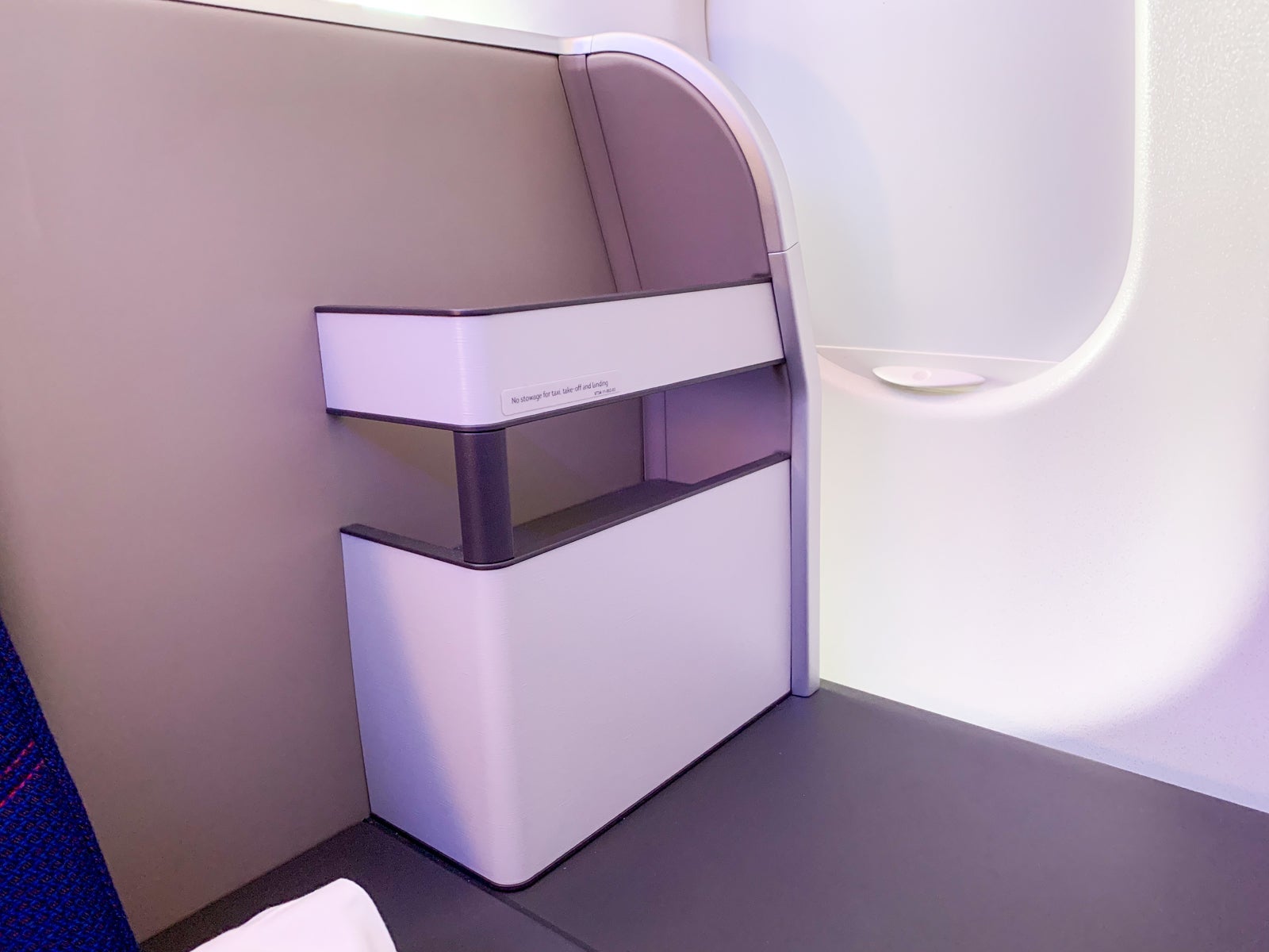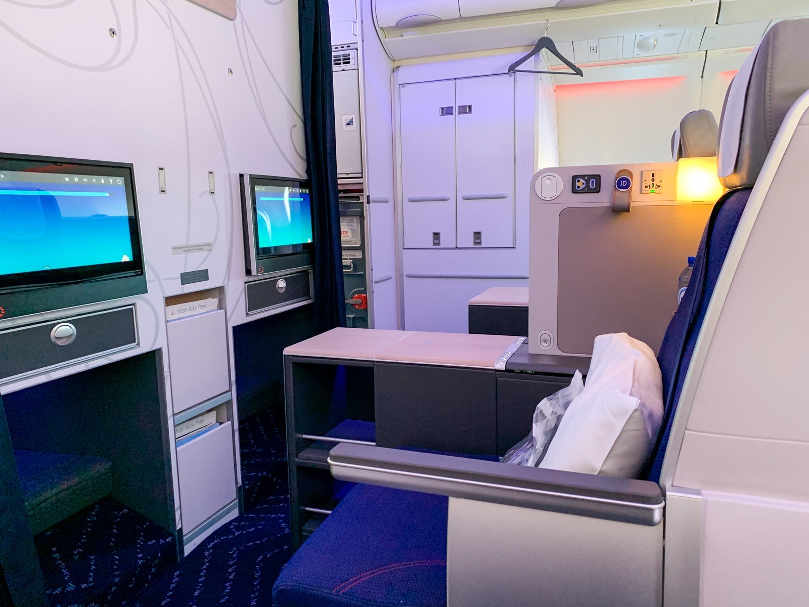 I was seated in 1A, the bulkhead throne that offered an extra storage compartment on the floor as well as an oversized footwell.