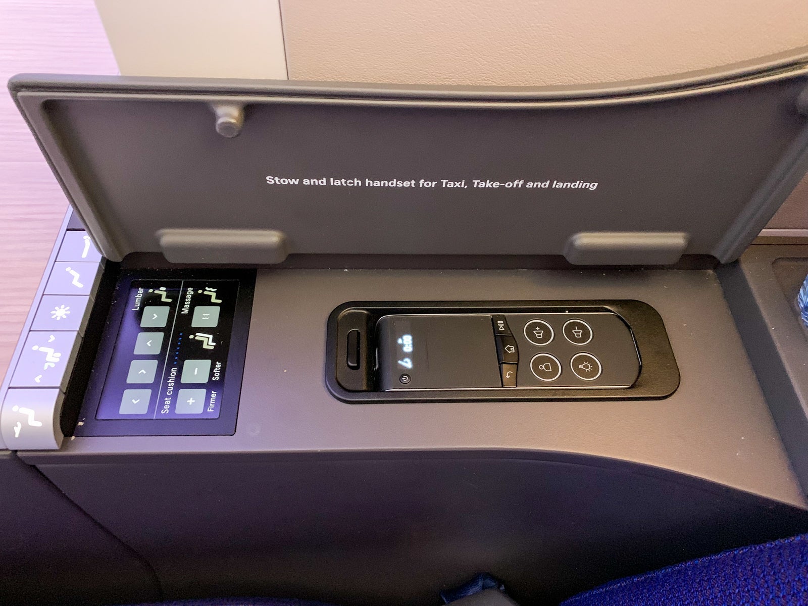 There were basic seat-control functions on the right armrest, and opening the IFE remote compartment revealed advanced seat functions like lumbar support, massage functions and an adjuster for the way the seat cushion felt.