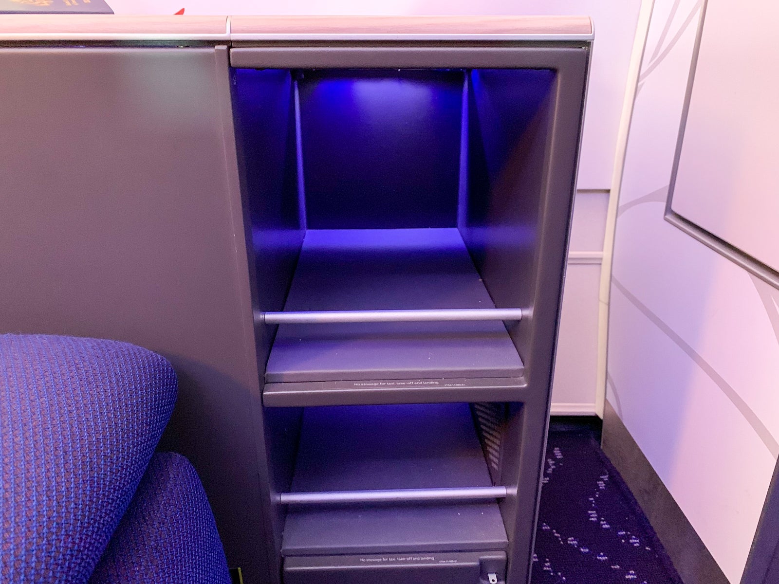 Most seats featured two shelves of storage for shoes or loose items, and some seats also had deep storage compartments next to the tray table for laptops, books, etc.