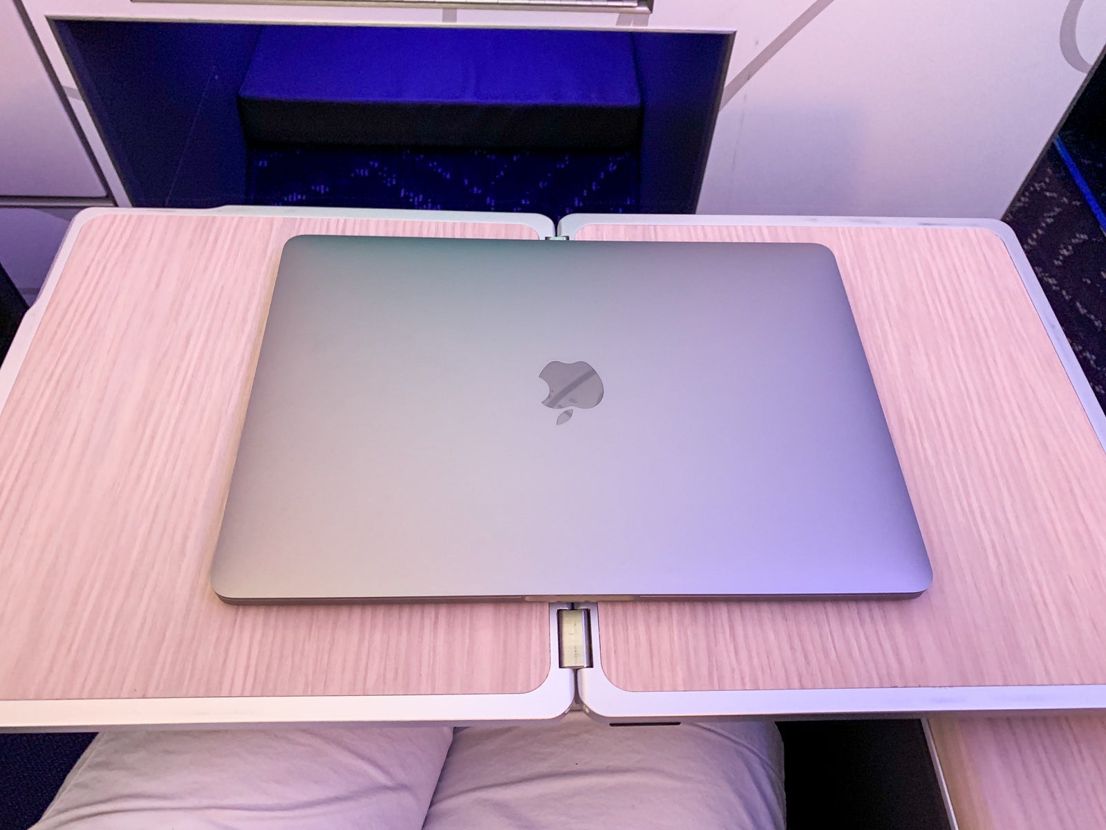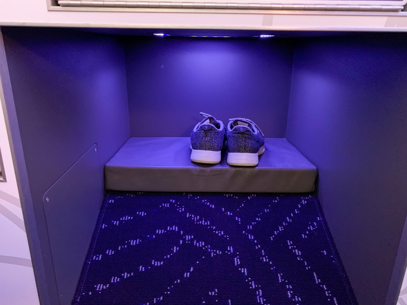 As I entered the plane, I turned left at the "lobby/bar." The cabin's finishes definitely felt fresh and snazzy, especially with the mood lighting.