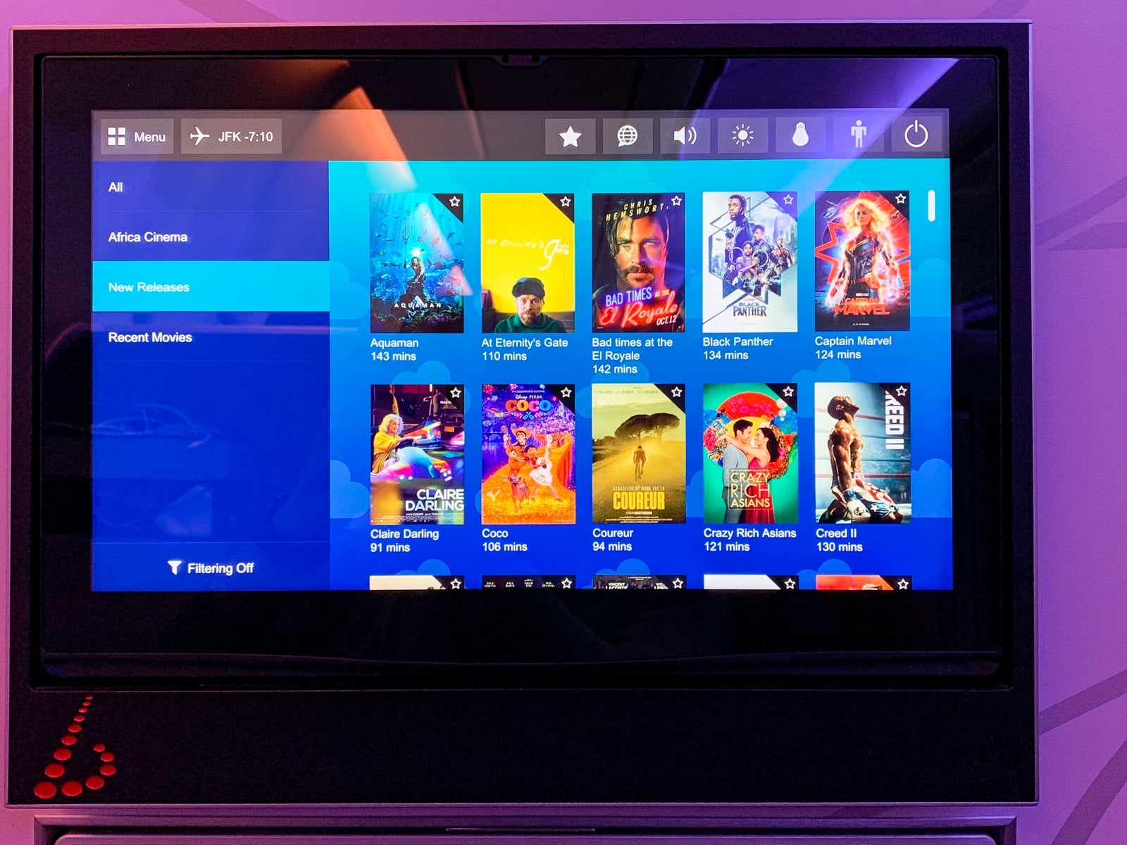 The two biggest issues with the IFE were that, one, the TV was highly reflective, so everyone needed to close their windows in order to really see anything other than yourself, and, two, the TV software kept resetting my movie to the beginning and also took more than two minutes to register a touch or remote command.
