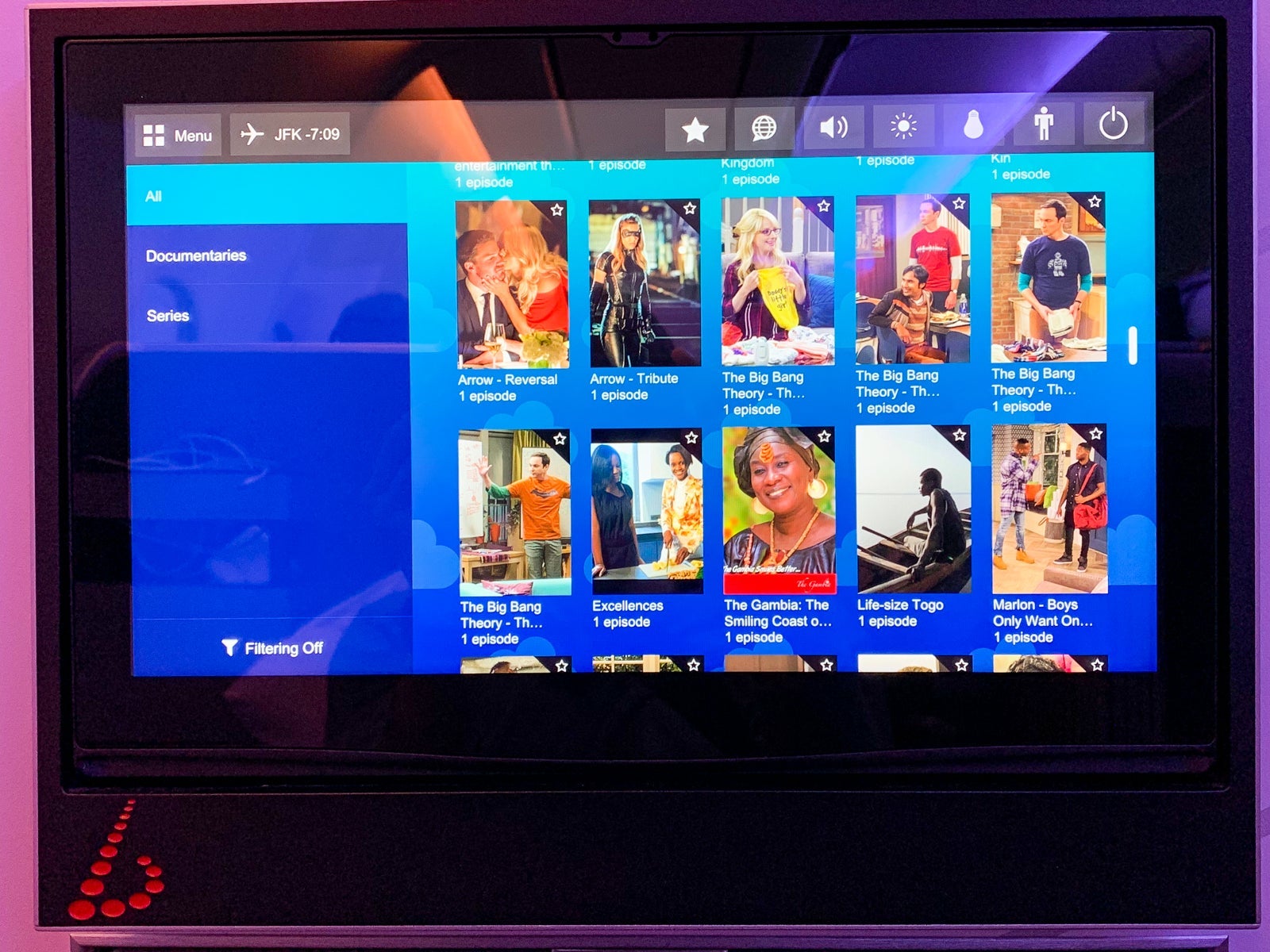 Annoyingly, the IFE only had one TV episode per season. Some of the titles included "The Big Bang Theory," "Arrow," "Marlon" and "Westworld."