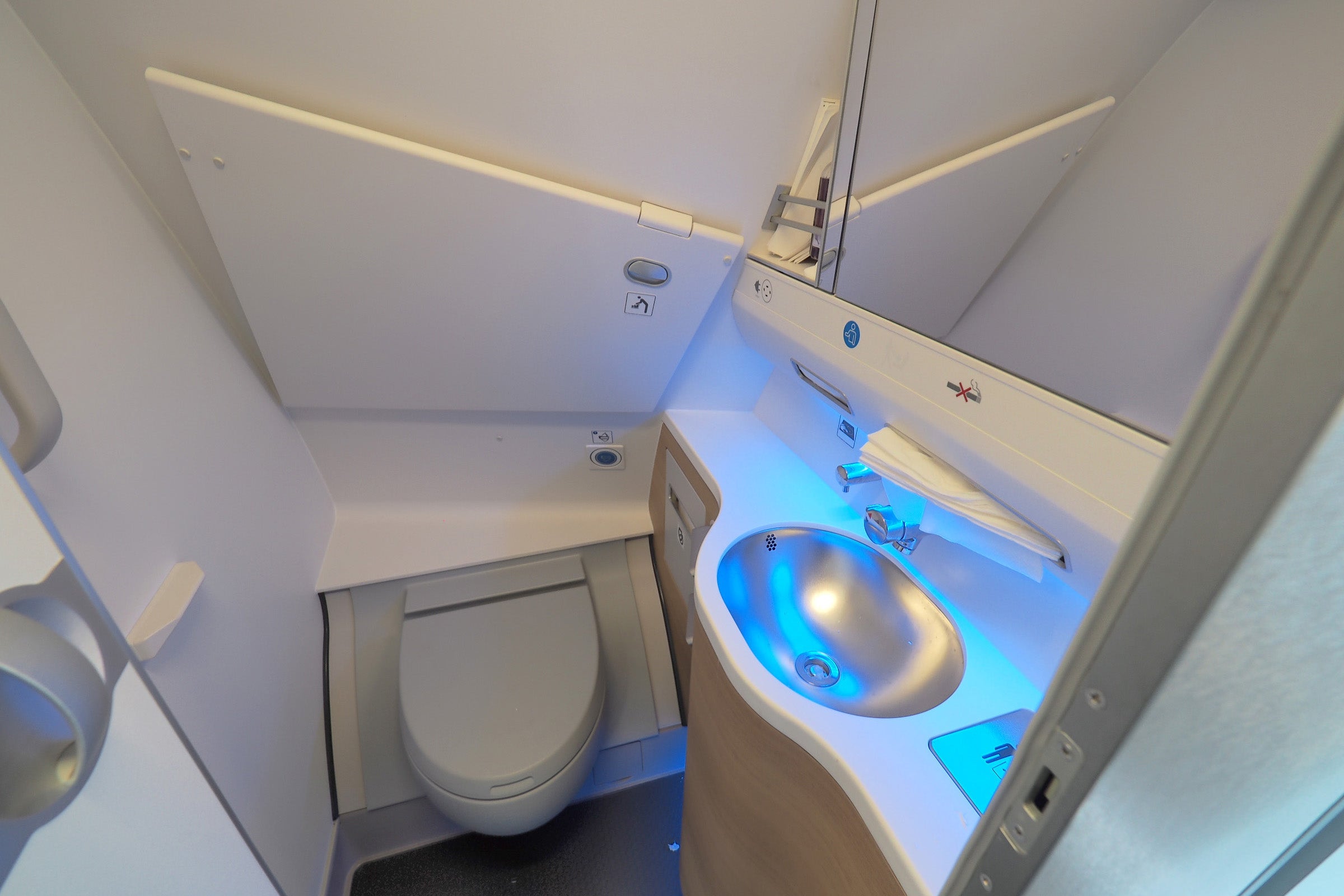 There are two lavatories available between business class and coach, plus one more at the front of the biz cabin. They're not especially exciting — I find the lavatories to have a more modern, spacious feel on the A350.