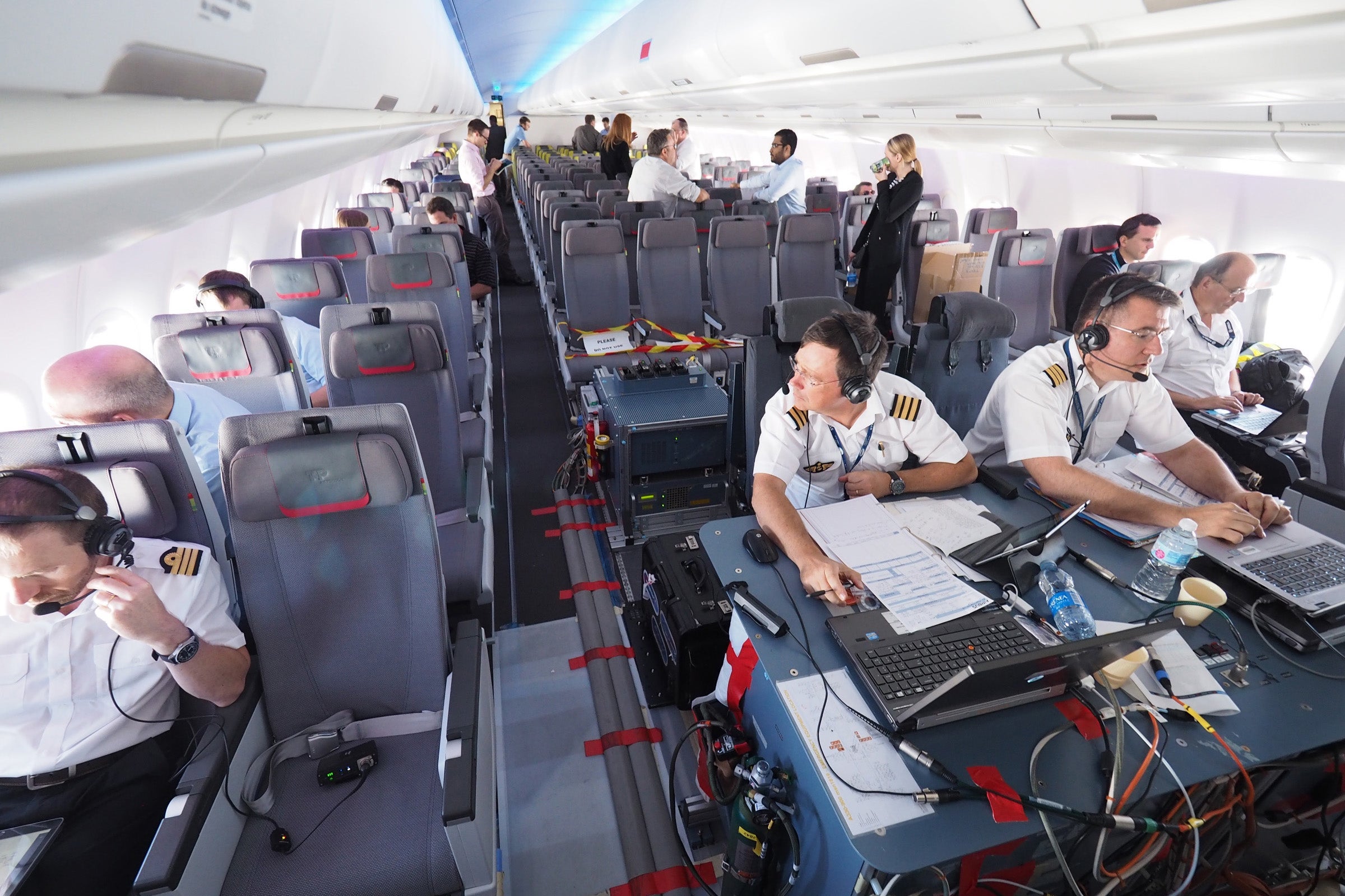 Since this wasn't a commercial flight, and the priority was the various testing taking place in the economy cabin, Airbus didn't assign seats — we were just told to grab whichever business-class seat we'd like.