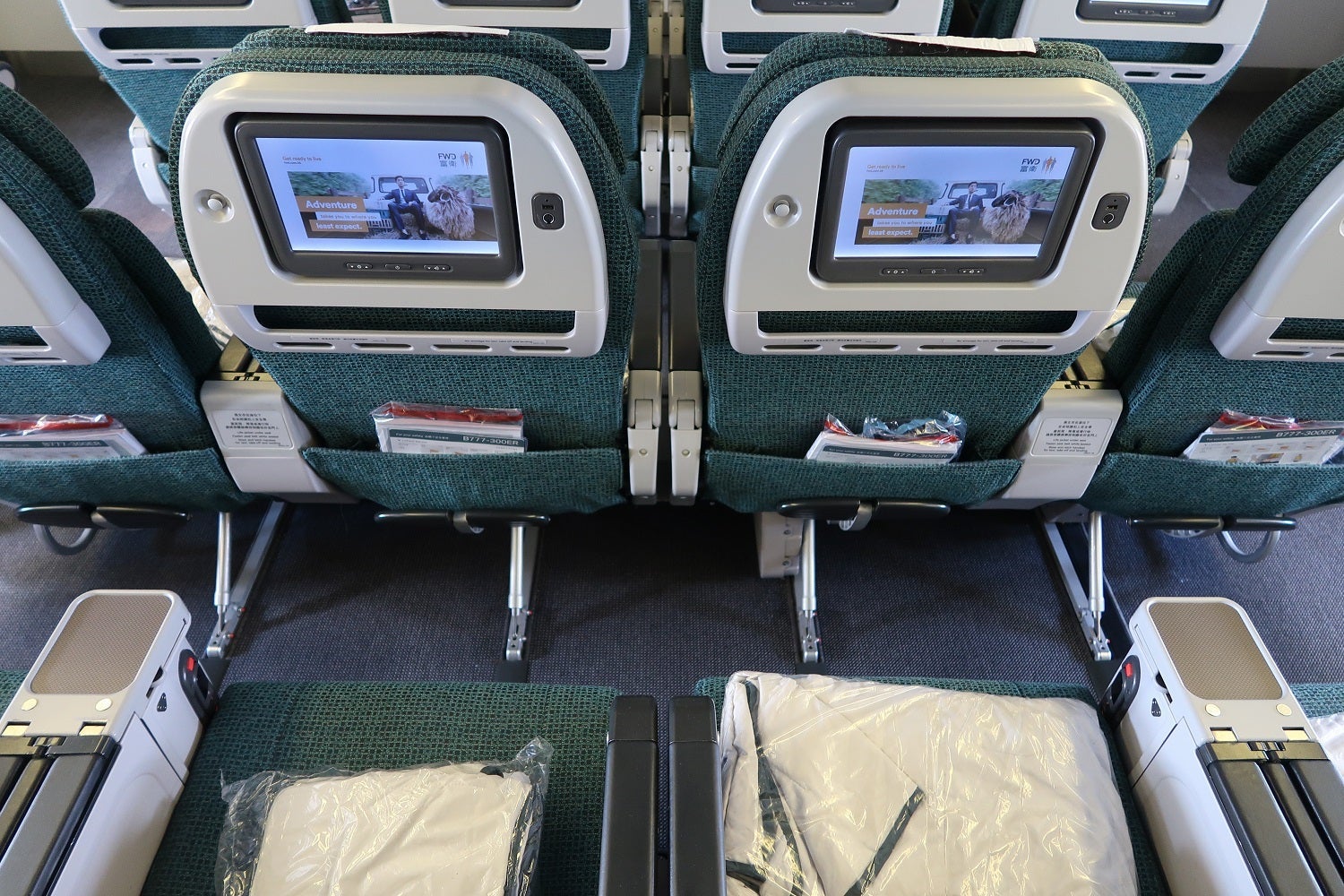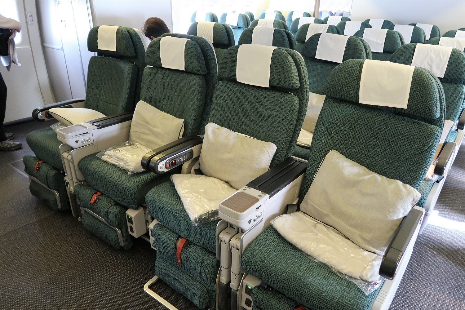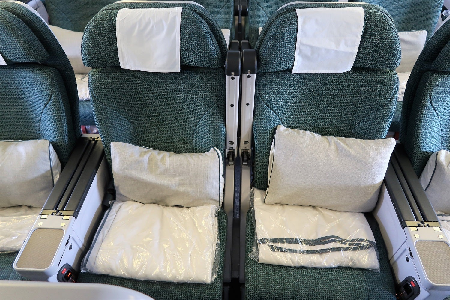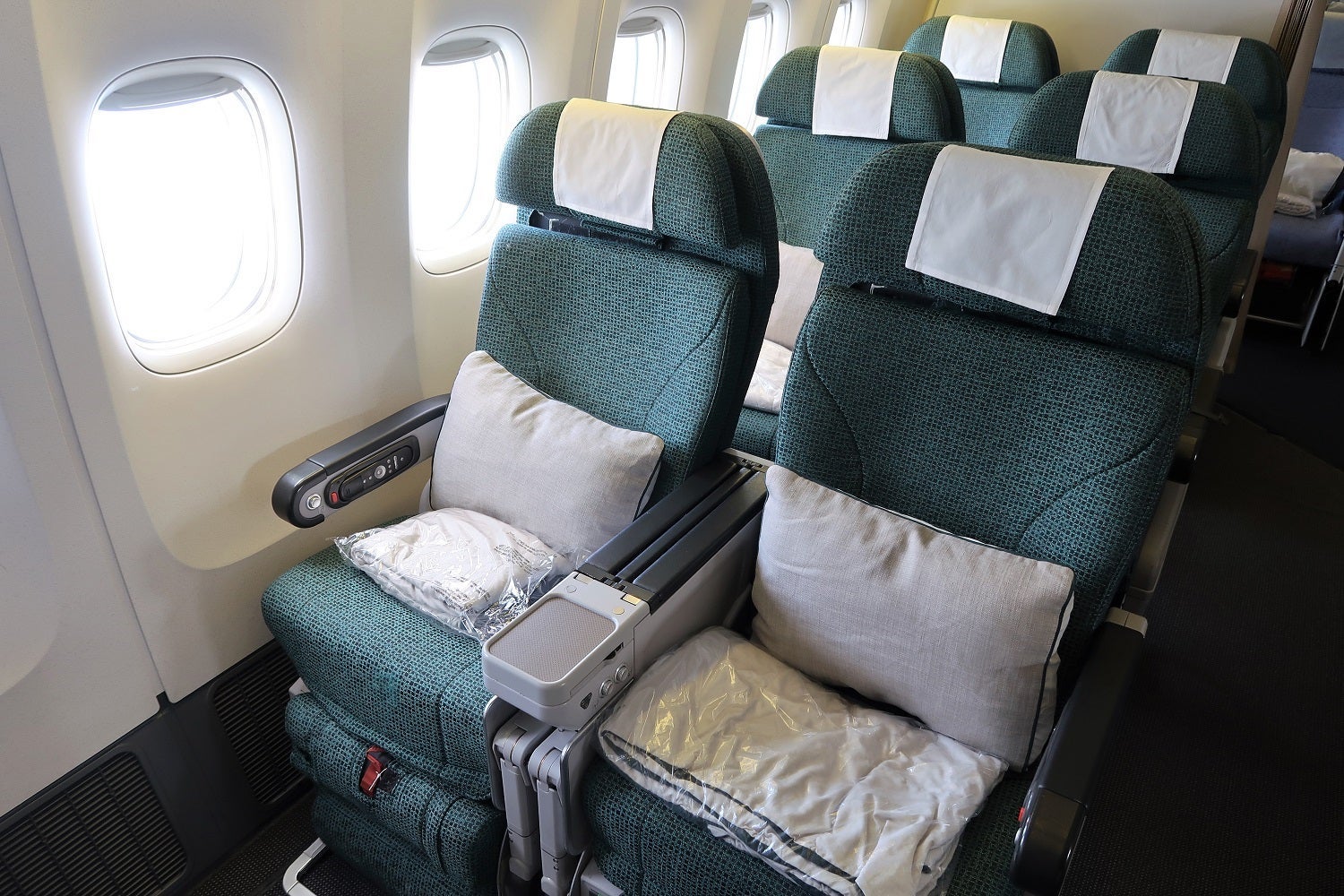 Both premium-economy cabins are arranged in a 2-4-2 arrangement rather than the 3-3-3 arrangement in economy on both aircraft. While 10-wide economy seating is coming to Cathay Pacific 777s, it wasn't yet on this particular flight. Once it does come, though, the extra space in premium economy will be even nicer. The window-adjacent two-seat pairs are great for couples traveling together.