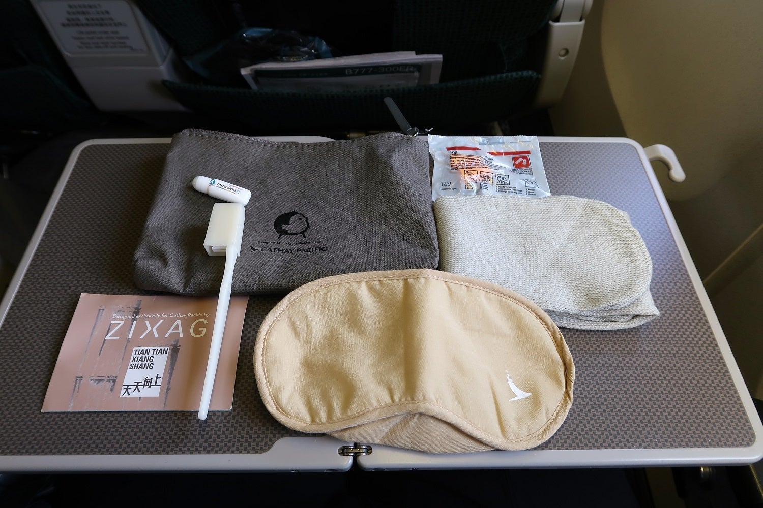 Both flights had the same simple amenity kit containing a cloth eye mask, socks, earplugs, toothbrush and toothpaste in a cloth zipper bag.
